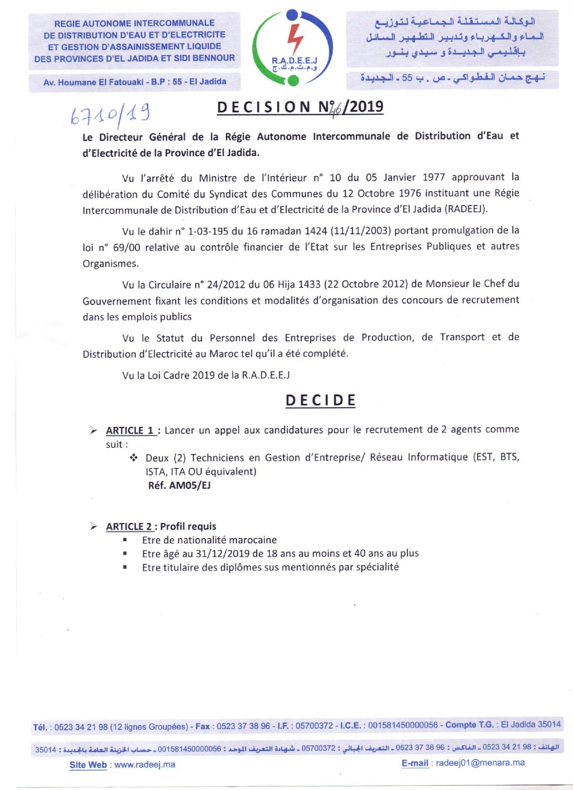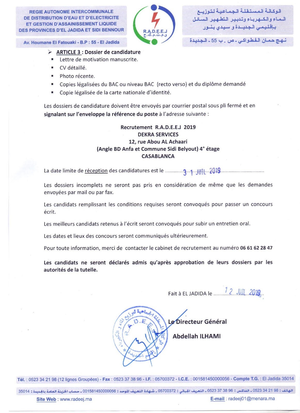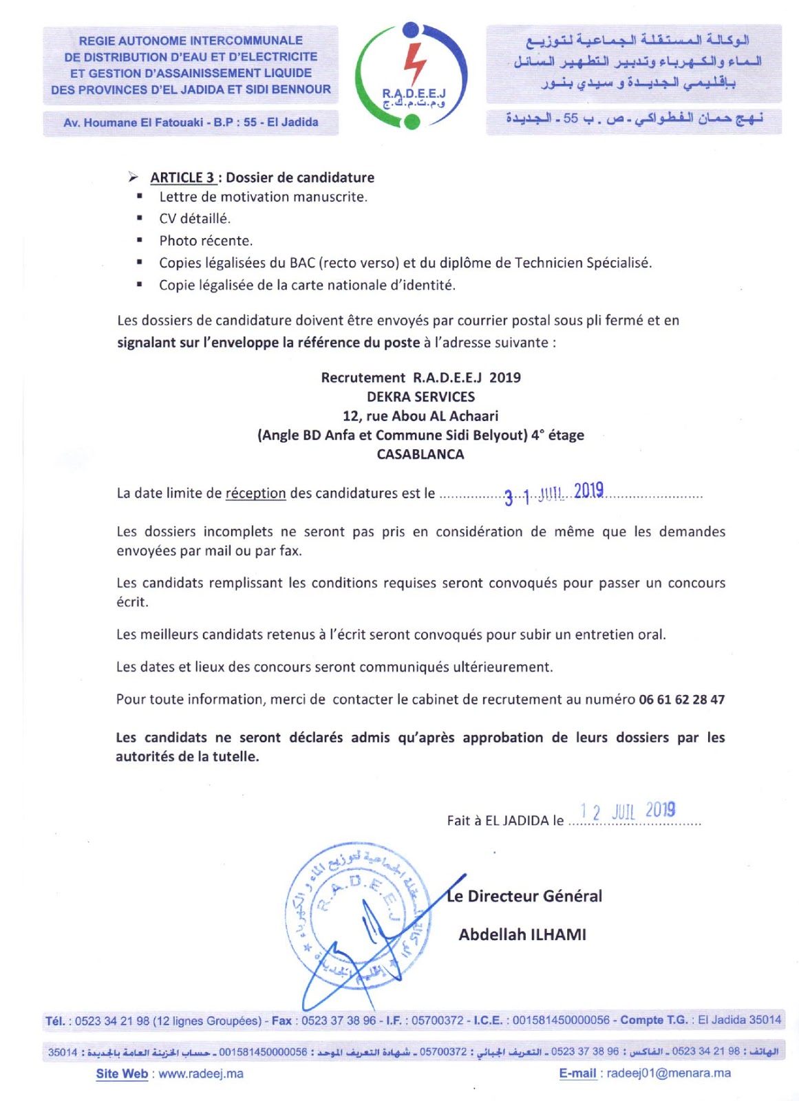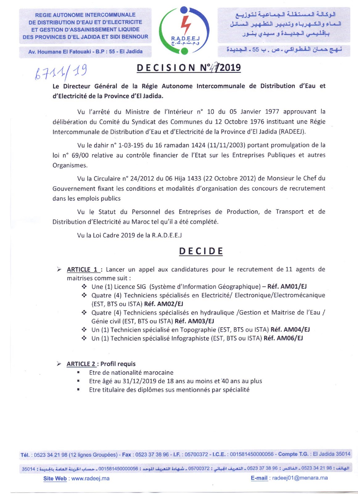 Alwadifa Eljadida / Alwadifa licence / Alwadifa Maroc / Alwadifa technicien / Autres offres d'emploi / Emploi diplomés / Emploi public / Offre d'emploi maroc / Offres d'emploi Licence / Offres d'emploi RADEE / Offres d'emploi technicien / Par fonction / Par ville / Plusieurs profils / Type الوكالة المستقلة الجماعية لتوزيع الماء والكهرباء بالجديدة مباراة لتوظيف 11 عون إشراف آخر أجل 31 يوليوز 2019 ShareSharePin It الوكالة المستقلة الجماعية لتوزيع الماء والكهرباء بالجديدة مباراة لتوظيف 11 عون إشراف آخر أجل 31 يوليوز 2019 نص الاعلان