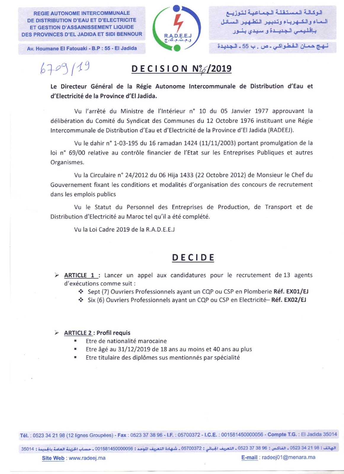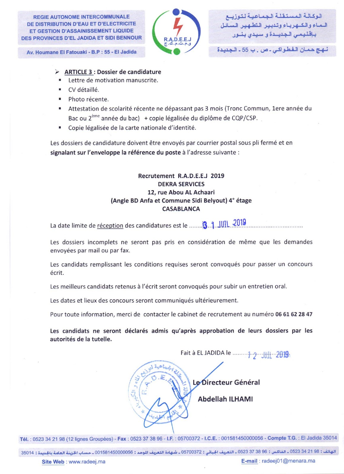 Alwadifa baccalauréat / Alwadifa Eljadida / Alwadifa Maroc / Autres offres d'emploi / Emploi diplomés / Emploi public / Offre d'emploi maroc / Offres d'emploi Bac + 2 / Offres d'emploi baccalauréat / Offres d'emploi RADEE / Par fonction / Par ville / Type الوكالة المستقلة الجماعية لتوزيع الماء والكهرباء بالجديدة مباراة لتوظيف 13 عون تنفيد آخر أجل 31 يوليوز 2019 ShareSharePin It الوكالة المستقلة الجماعية لتوزيع الماء والكهرباء بالجديدة مباراة لتوظيف 13 عون تنفيد آخر أجل 31 يوليوز 2019 نص الاعلان