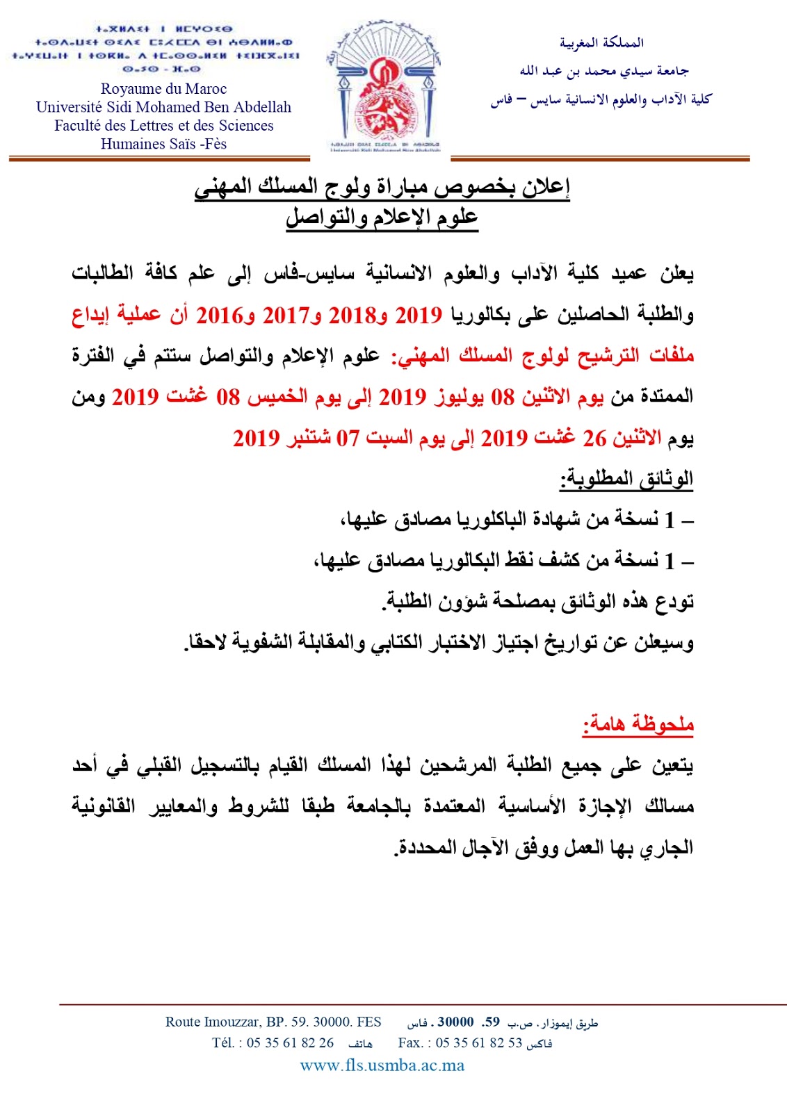 Alwadifa Fes / Alwadifa Maroc / Emploi public / Etablissement Public / Offre d'emploi maroc / Offre d'emploi maroc / Offre d’emploi Fes / Par ville / Type كلية الآداب و العلوم الإنسانية سايس فاس مباراة ولوج المسلك المهني علوم الإعلام والتواصل 2019-2020 ShareSharePin It كلية الآداب و العلوم الإنسانية سايس فاس إعلان بخصوص مباراة ولوج المسلك المهني علوم الإعلام والتواصل 2019-2020