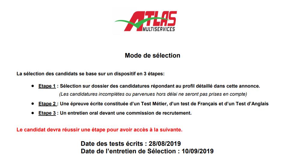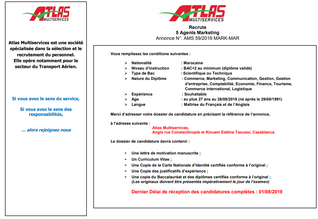Alwadifa Maroc / Alwadifa tout le Maroc / Atlas Multiservices / Emploi diplomés / Emploi public / Offre d'emploi maroc / Offres d'emploi Bac + 2 / Par fonction / Par ville / Type أطلس مولتي سيرفيس مباراة لتوظيف 05 أعوان تسويق آخر أجل 1 غشت 2019 ShareSharePin It أطلس مولتي سيرفيس مباراة لتوظيف 05 أعوان تسويق آخر أجل 1 غشت 2019 نص الاعلان