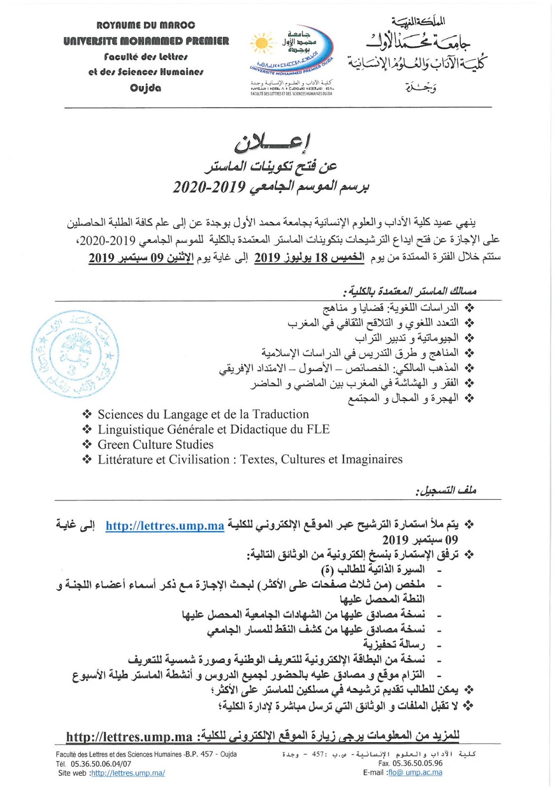 Alwadifa Maroc / Alwadifa Oujda / Emploi public / Etablissement Public / Master FLSH Oujda / Master Maroc / Offre d'emploi maroc / Par ville / Type الماسترات المفتوحة بكلية الآداب والعلوم الانسانية وجدة 2019-2020 ShareSharePin It الماسترات المفتوحة بكلية الآداب والعلوم الانسانية وجدة 2019-2020 رابط التسجيل