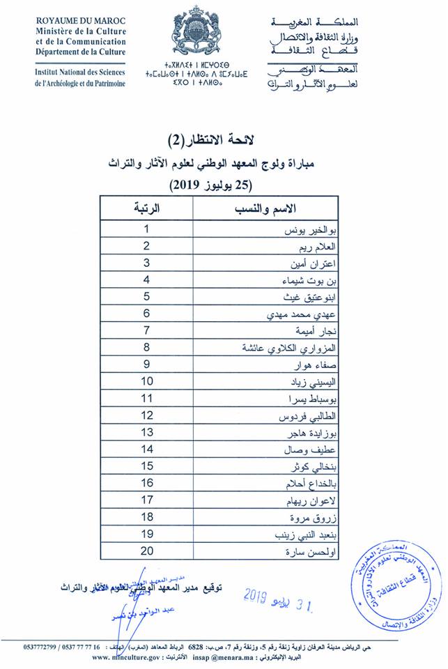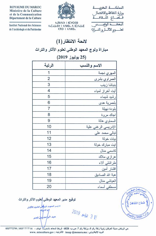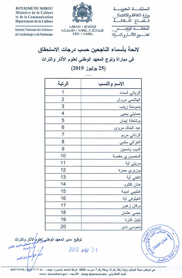 Alwadifa Maroc / Emploi public / Etablissement Public / Offre d'emploi maroc / Resultats du concours / Type لائحة بأسماء الناجحين حسب درجات الاستحقاق في مباراة المعهد الوطني لعلوم الآثار والتراث 2019-2020 ShareSharePin It لائحة بأسماء الناجحين حسب درجات الاستحقاق في مباراة المعهد الوطني لعلوم الآثار والتراث 2019-2020 لائحة بأسماء الناجحين