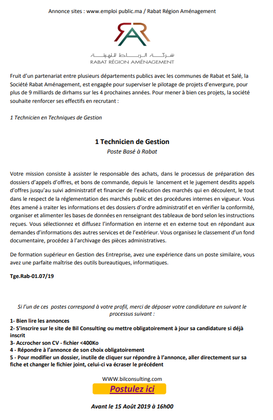 Alwadifa Maroc / Alwadifa Rabat / Alwadifa technicien / Autres offres d'emploi / Emploi public / Etablissement Public / Offre d'emploi maroc / Offre d'emploi maroc / Offre d'emploi Rabat / Offres d'emploi technicien / Par fonction / Par ville / Type شركة الرباط الجهة للتهيئة مباراة لتوظيف 01 تقني التدبير آخر أجل 15 غشت 2019 ShareSharePin It شركة الرباط الجهة للتهيئة مباراة لتوظيف 01 تقني التدبير آخر أجل 15 غشت 2019 POSTULEZ ICI