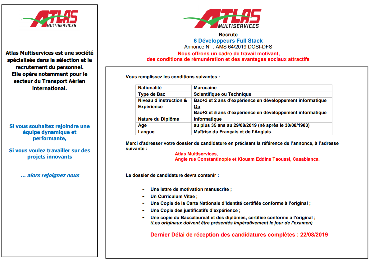Alwadifa Maroc / Alwadifa tout le Maroc / Atlas Multiservices / Emploi public / Offre d'emploi maroc / Offres d'emploi Bac + 3 / Par fonction / Par ville / Type أطلس مولتي سيرفيس مباراة لتوظيف 06 مطورين معلوماتيين آخر أجل 22 غشت 2019 ShareSharePin It أطلس مولتي سيرفيس مباراة لتوظيف 06 مطورين معلوماتيين آخر أجل 22 غشت 2019 نص الاعلان
