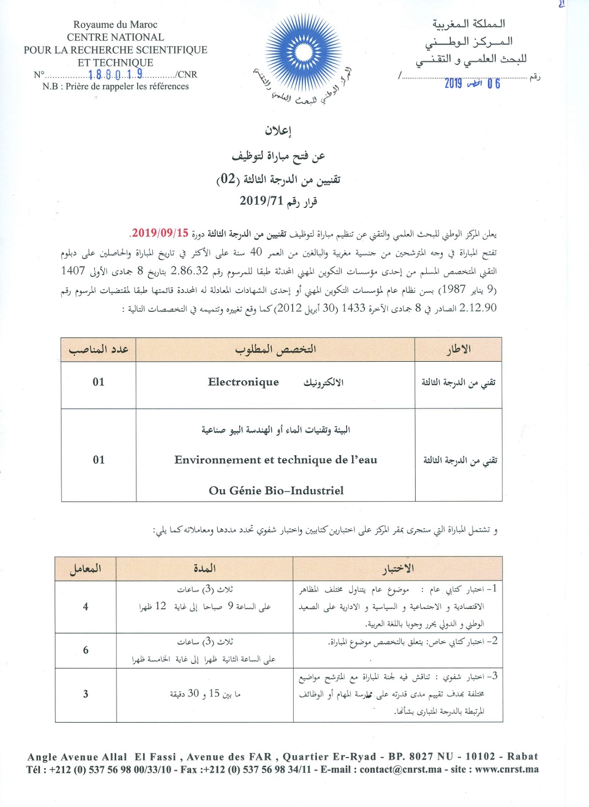 Alwadifa Maroc / Alwadifa technicien / Alwadifa tout le Maroc / Autres offres d'emploi / Emploi public / Etablissement Public / Offre d'emploi maroc / Offres d'emploi technicien / Par fonction / Par ville / Type المركز الوطني للبحث العلمي والتقني مباراة لتوظيف 02 تقنيين من الدرجة الثالثة آخر أجل 31 غشت 2019 ShareSharePin It المركز الوطني للبحث العلمي والتقني مباراة لتوظيف 02 تقنيين من الدرجة الثالثة آخر أجل 31 غشت 2019 نص الاعلان
