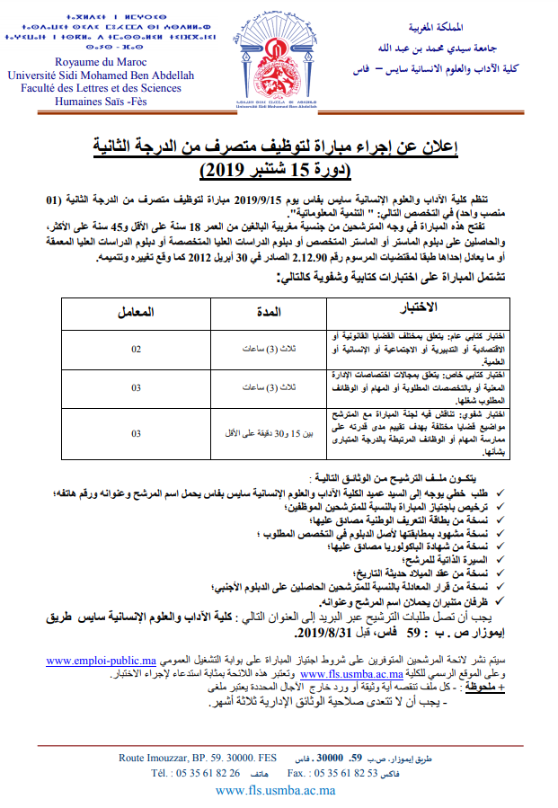 Alwadifa Fes / Alwadifa Maroc / Alwadifa master / Autres offres d'emploi / Emploi public / Etablissement Public / Offre d'emploi maroc / Offre d'emploi maroc / Offre d’emploi Fes / Offres d'emploi master / Par fonction / Par ville / Type كلية الآداب والعلوم الإنسانية سايس بفاس مباراة توظيف متصرف من الدرجة الثانية آخر أجل 31 غشت 2019 ShareSharePin It كلية الآداب والعلوم الإنسانية سايس بفاس مباراة توظيف متصرف من الدرجة الثانية آخر أجل 31 غشت 2019 نص الاعلان