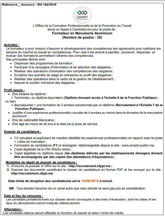 Alwadifa Maroc / Alwadifa technicien / Alwadifa tout le Maroc / Autres offres d'emploi / Emploi public / Offre d'emploi maroc / Offres d'emploi OFPPT / Offres d'emploi technicien / Par fonction / Par ville / Type مكتب التكوين المهني وإنعاش الشغل مباراة لتوظيف 30 مكون في نجارة الاليمنيوم آخر أجل 15 شتنبر 2019 ShareSharePin It مكتب التكوين المهني وإنعاش الشغل مباراة لتوظيف 30 مكون في نجارة الاليمنيوم آخر أجل 15 شتنبر 2019 استمارة الترشح