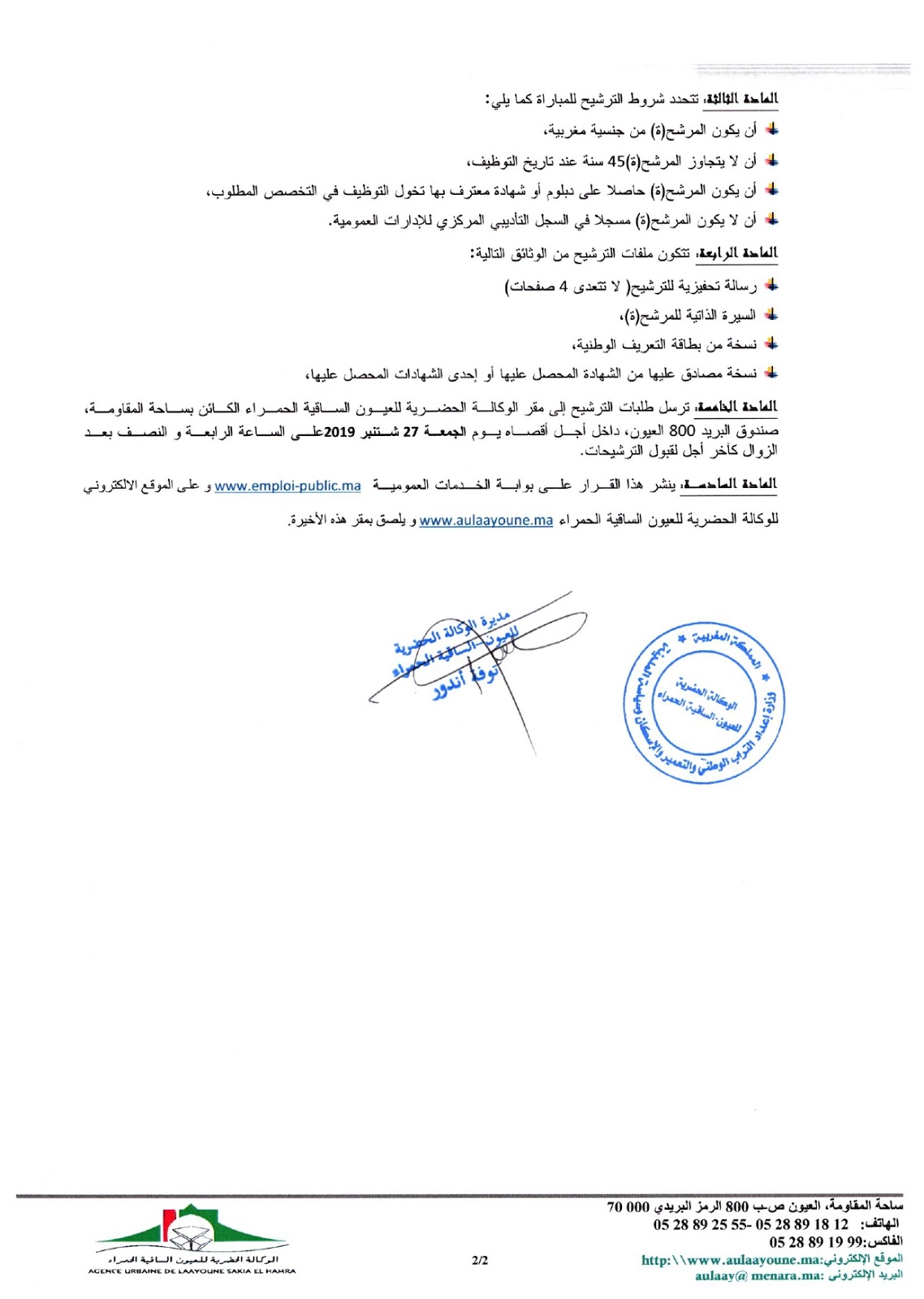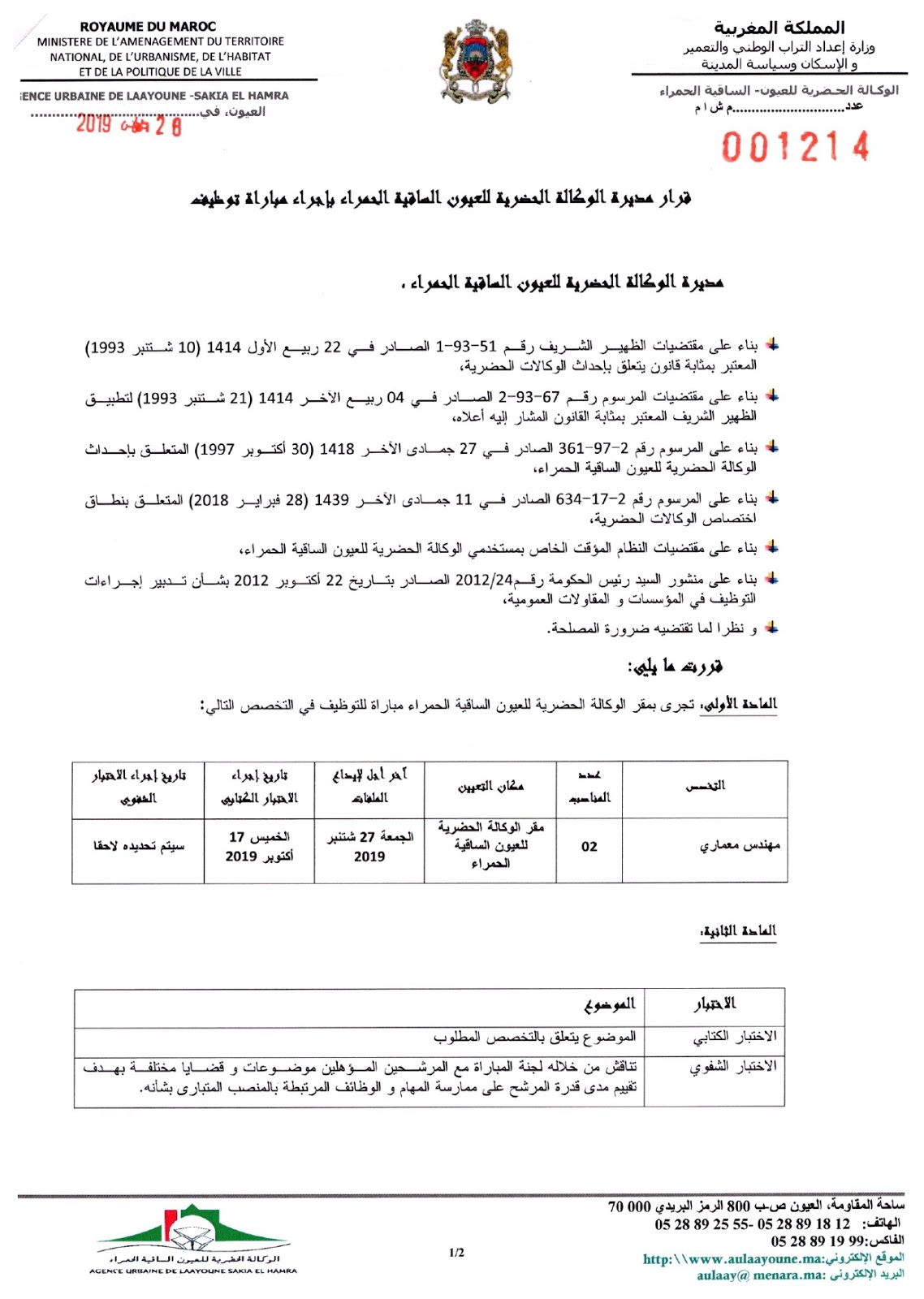 Alwadifa ingenieur / Alwadifa Laayoune / Alwadifa Maroc / Autres offres d'emploi / Emploi public / Etablissement Public / Offre d'emploi maroc / Offres d'emploi ingenieur / Par fonction / Par ville / Type الوكالة الحضرية للعيون مباراة لتوظيف 02 مهندسين معماريين من الدرجة الأولى آخر أجل 27 شتنبر 2019 ShareSharePin It الوكالة الحضرية للعيون مباراة لتوظيف 02 مهندسين معماريين من الدرجة الأولى آخر أجل 27 شتنبر 2019 نص الاعلان