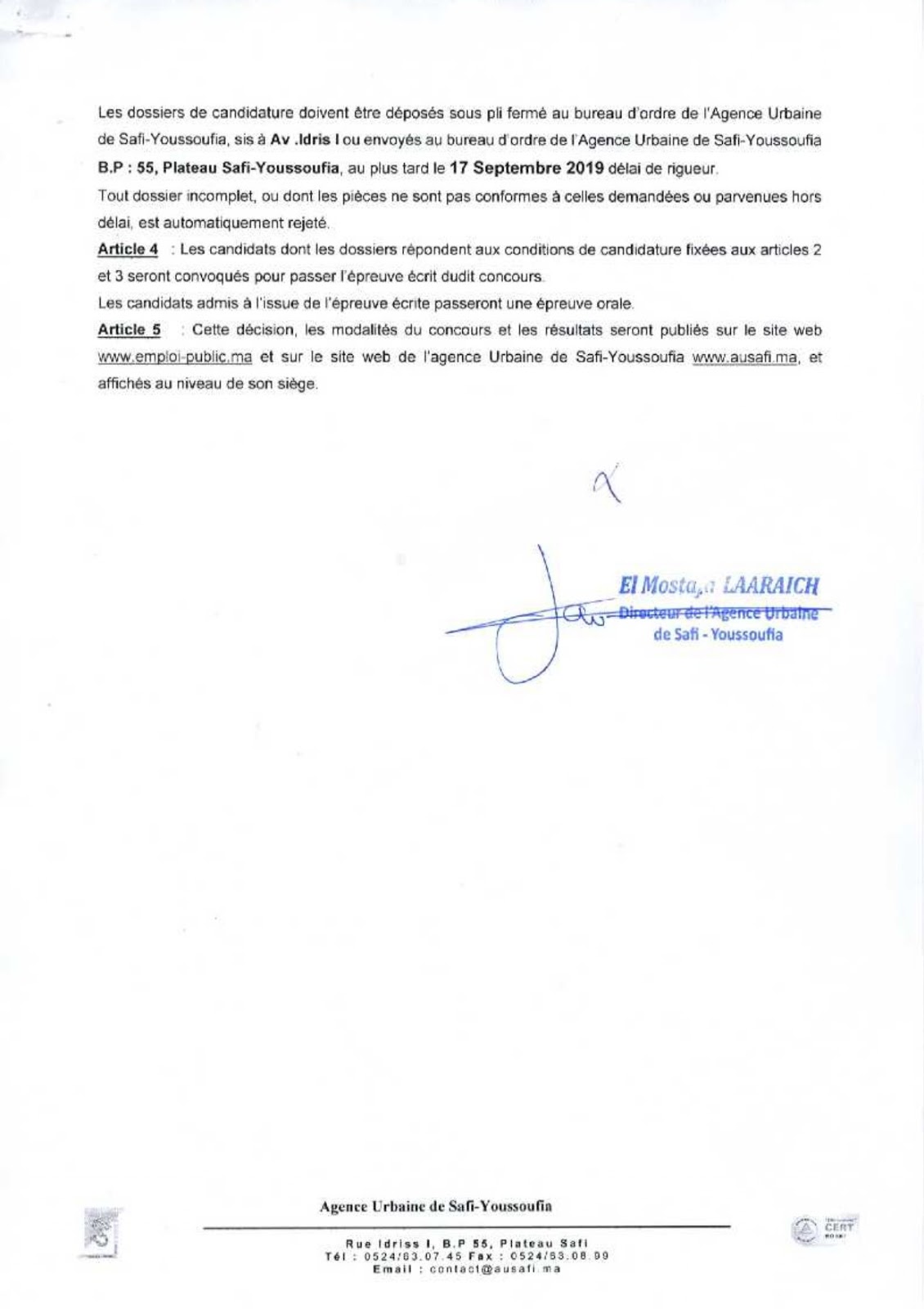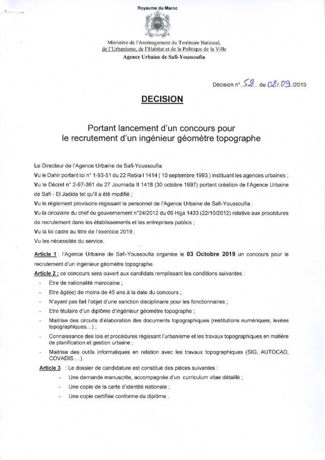Alwadifa ingenieur / Alwadifa Maroc / Alwadifa Safi / Autres offres d'emploi / Emploi public / Etablissement Public / Offre d'emploi maroc / Offres d'emploi ingenieur / Par fonction / Par ville / Type الوكالة الحضرية لآسفي مباراة لتوظيف مهندس طبوغرافي آخر أجل 17 شتنبر 2019 ShareSharePin It الوكالة الحضرية لآسفي مباراة لتوظيف مهندس طبوغرافي آخر أجل 17 شتنبر 2019 نص الاعلان