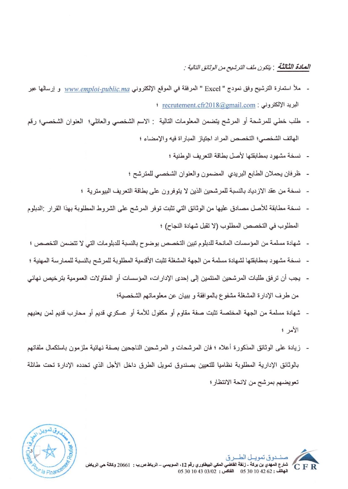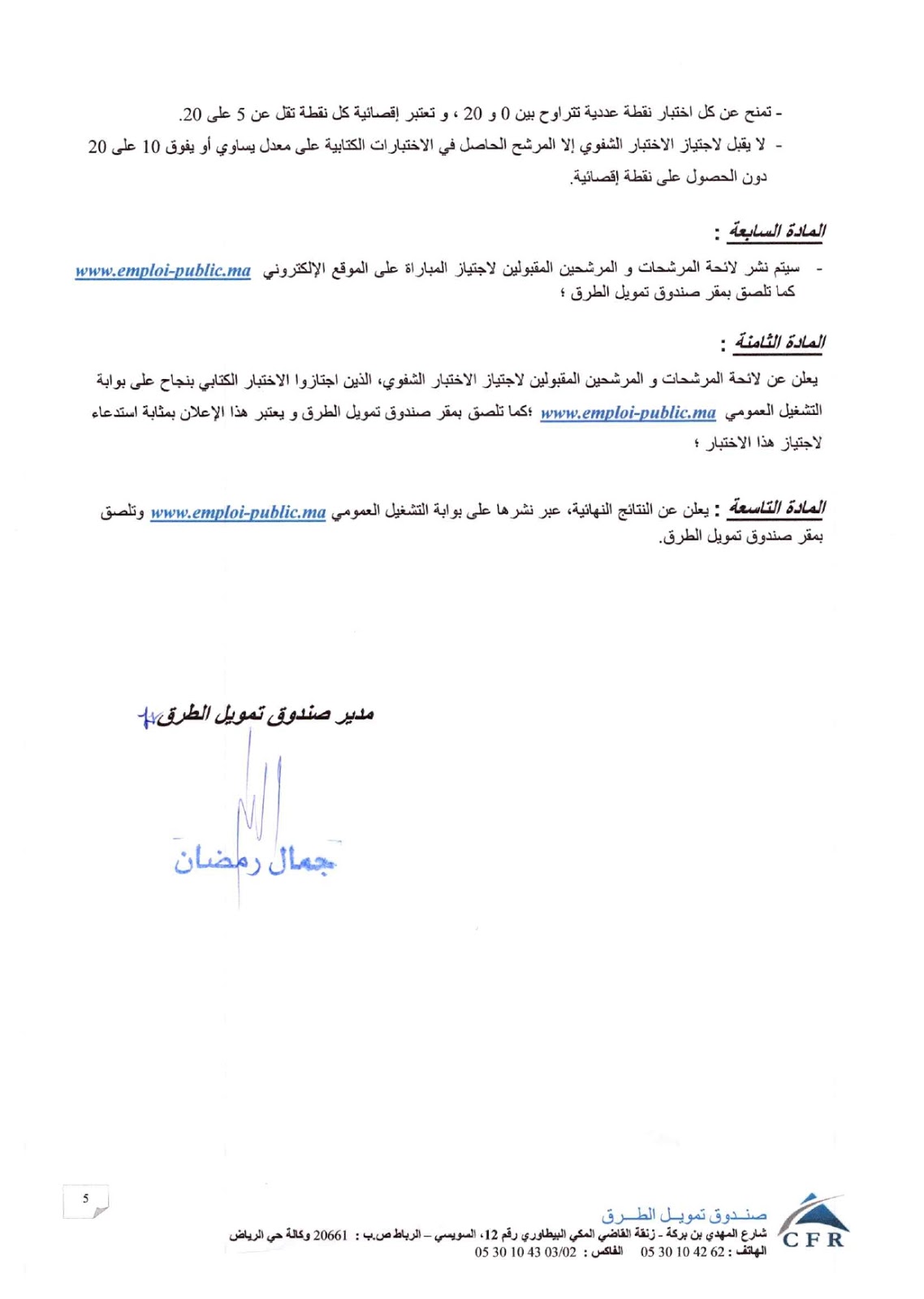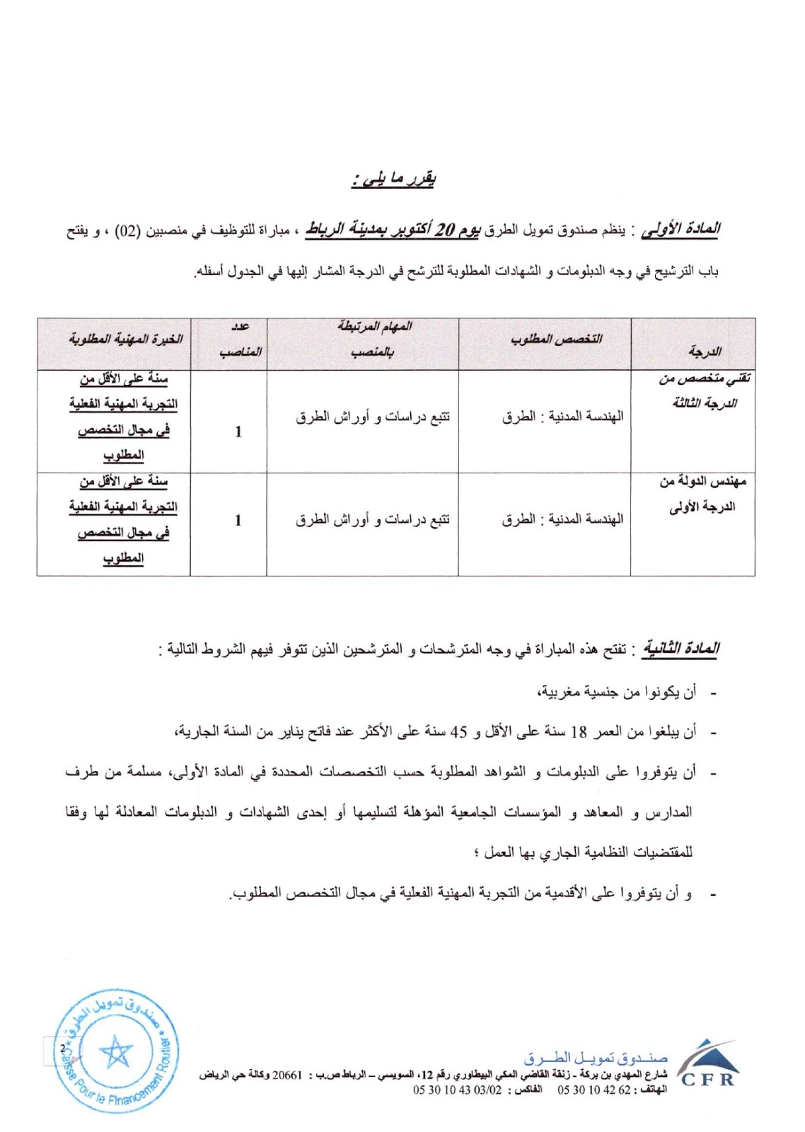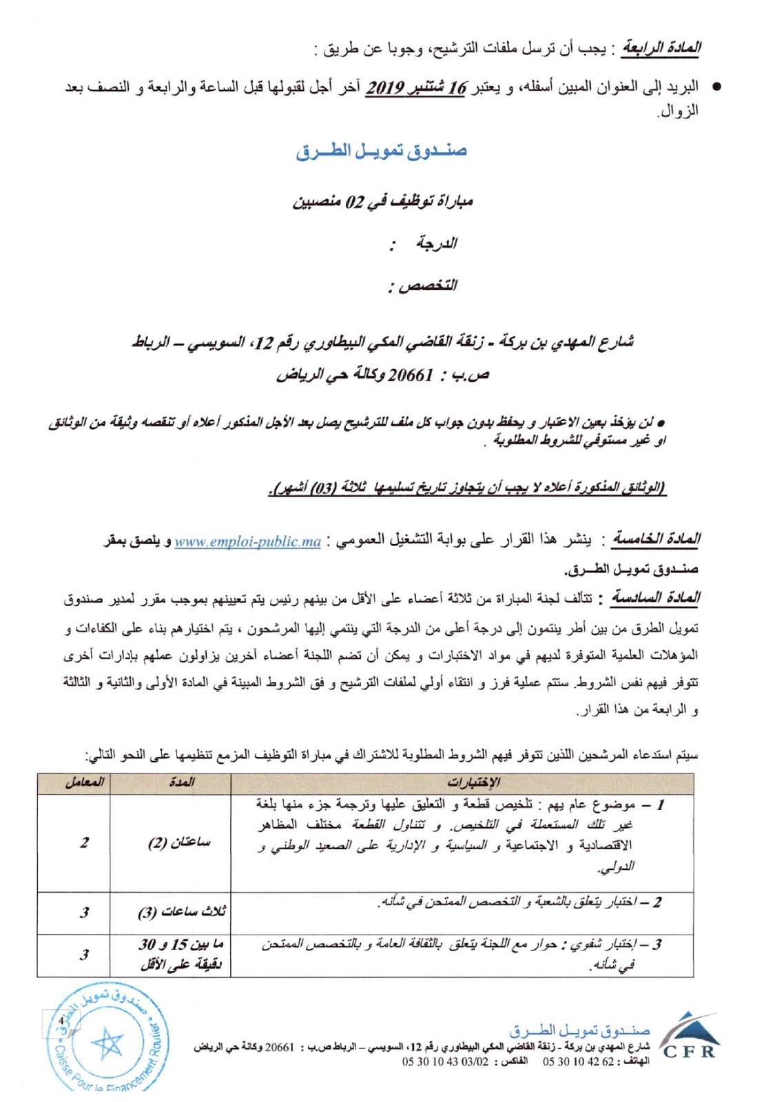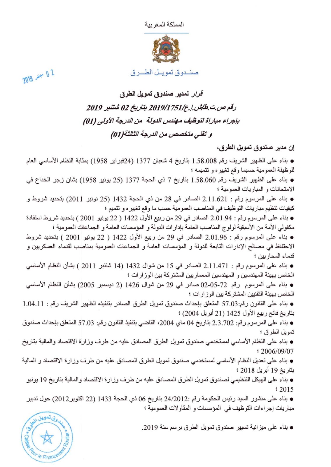 Alwadifa ingenieur / Alwadifa Maroc / Alwadifa technicien / Alwadifa tout le Maroc / Autres offres d'emploi / Emploi public / Etablissement Public / Offre d'emploi maroc / Offres d'emploi ingenieur / Offres d'emploi technicien / Par fonction / Par ville / Type صندوق تمويل الطرق: مباراة توظيف مهندس دولة وتقني من الدرجة الثالثة تخصص الطرق. آخر أجل هو يوم 16 شتنبر 2019 ShareSharePin It صندوق تمويل الطرق مباراة لتوظيف 01 تقني من الدرجة الثالثة و01 مهندس دولة من الدرجة الأولى آخر أجل 16 شتنبر 2019 استمارة الترشح