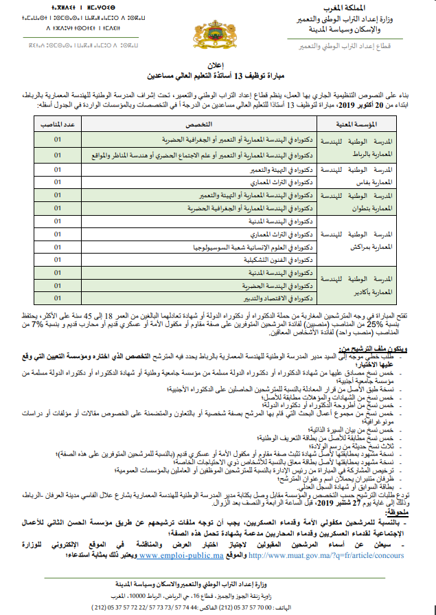 Alwadifa doctorat / Alwadifa Maroc / Alwadifa tout le Maroc / Autres offres d'emploi / Emploi public / Etablissement Public / Offre d'emploi maroc / Offres d'emploi doctorat / Par fonction / Par ville / Type قطاع إعداد التراب الوطني والتعمير مباراة لتوظيف 13 أستاذ التعليم العالي مساعدين آخر أجل 27 شتنبر 2019 ShareSharePin It قطاع إعداد التراب الوطني والتعمير مباراة لتوظيف 13 أستاذ التعليم العالي مساعدين آخر أجل 27 شتنبر 2019 نص الاعلان