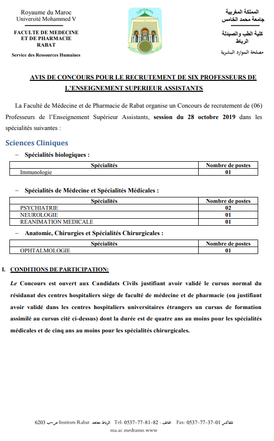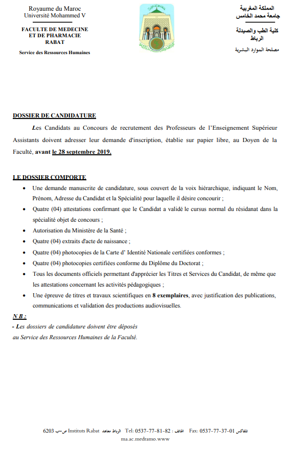 Alwadifa doctorat / Alwadifa Maroc / Alwadifa Rabat / Autres offres d'emploi / Emploi public / Etablissement Public / Offre d'emploi maroc / Offre d'emploi maroc / Offre d'emploi Rabat / Offres d'emploi doctorat / Par fonction / Par ville / Type كلية الطب والصيدلة الرباط مباراة لتوظيف 06 أساتذة التعليم العالي مساعدين آخر أجل 27 شتنبر 2019 ShareSharePin It كلية الطب والصيدلة الرباط مباراة لتوظيف 06 أساتذة التعليم العالي مساعدين آخر أجل 27 شتنبر 2019 نص الاعلان