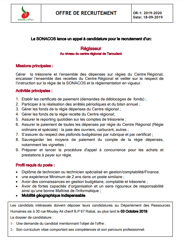 Alwadifa Maroc / Alwadifa technicien / Alwadifa tout le Maroc / Autres offres d'emploi / Emploi diplomés / Emploi public / Etablissement Public / Offre d'emploi maroc / Offres d'emploi technicien / Par fonction / Par ville / Type الشركة الوطنية لتسويق البذور « سوناكوس » مباراة لتوظيف أمين المال آخر أجل 3 اكتوبر 2019 ShareSharePin It الشركة الوطنية لتسويق البذور « سوناكوس » مباراة لتوظيف أمين المال آخر أجل 3 اكتوبر 2019 نص الاعلان