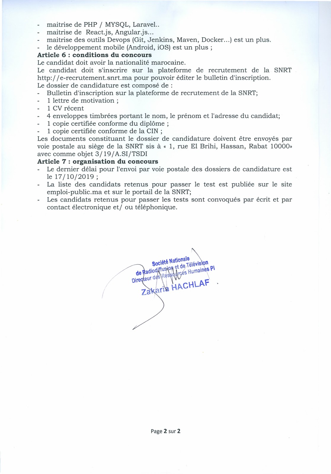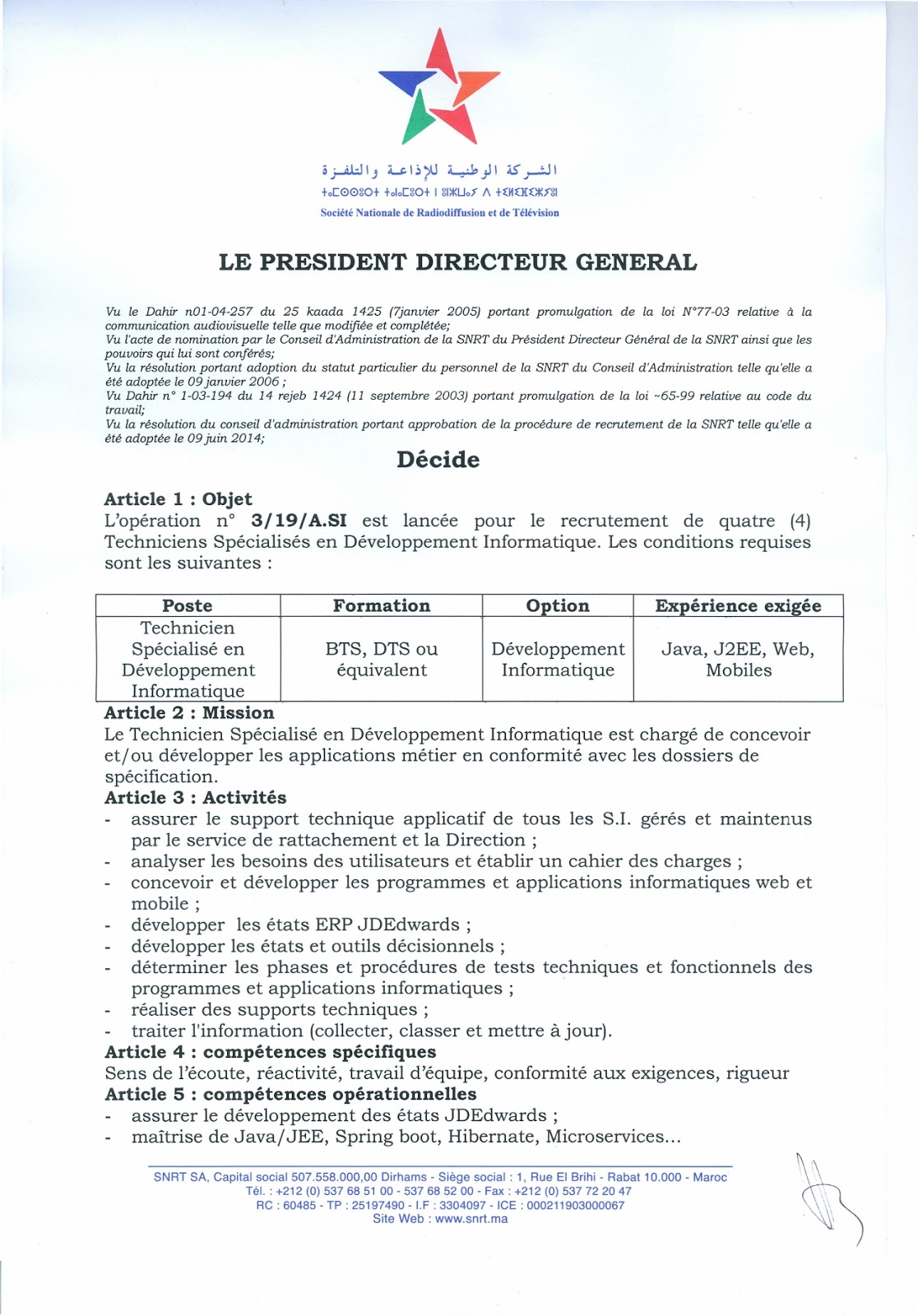 Alwadifa Maroc / Alwadifa technicien / Alwadifa tout le Maroc / Autres offres d'emploi / Emploi public / Offre d'emploi maroc / Offres d'emploi SNRT / Par ville / Type الشركة الوطنية للإذاعة والتلفزة مباراة لتوظيف 04 تقنيين متخصصين في التنمية المعلوماتية آخر أجل 17 اكتوبر 2019 ShareSharePin It الشركة الوطنية للإذاعة والتلفزة مباراة لتوظيف 04 تقنيين متخصصين في التنمية المعلوماتية آخر أجل 17 اكتوبر 2019
