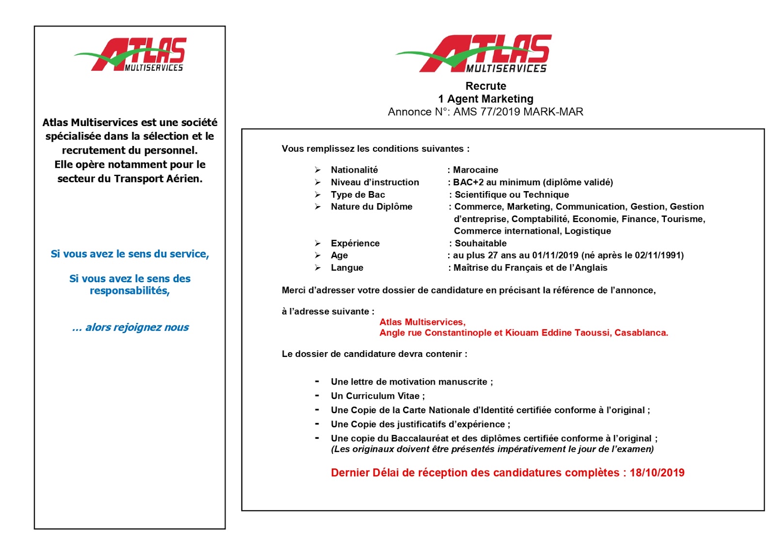 Alwadifa Maroc / Alwadifa tout le Maroc / Atlas Multiservices / Emploi public / Offre d'emploi maroc / Offres d'emploi Bac + 2 / Par fonction / Par ville / Type أطلس مولتي سيرفيس مباراة لتوظيف 01 عون تسويق آخر أجل 18 اكتوبر 2019 ShareSharePin It أطلس مولتي سيرفيس مباراة لتوظيف 01 عون تسويق آخر أجل 18 اكتوبر 2019