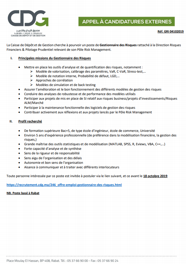Alwadifa Maroc / Alwadifa tout le Maroc / Emploi public / Offre d'emploi maroc / Offres d'emploi Bac + 5 / Offres d'emploi CDG / Par fonction / Par ville / Type صندوق الإيداع والتدبير مباراة لتوظيف 01 إطار عالي آخر أجل 18 اكتوبر 2019 ShareSharePin It صندوق الإيداع والتدبير مباراة لتوظيف 01 إطار عالي آخر أجل 18 اكتوبر 2019
