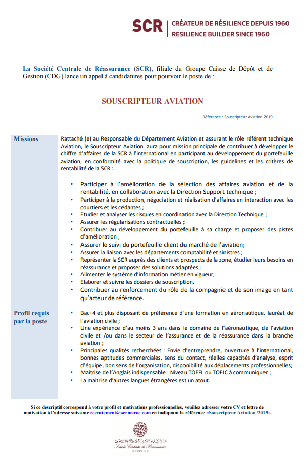 Alwadifa Maroc / Alwadifa tout le Maroc / Emploi public / Etablissement Public / Offre d'emploi maroc / Offres d'emploi Bac + 4 / Par fonction / Par ville / Type الشركة المركزية لإعادة التأمين مباراة لتوظيف 01 إطار في الإكتتاب آخر أجل 21 اكتوبر 2019 ShareSharePin It الشركة المركزية لإعادة التأمين مباراة لتوظيف 01 إطار في الإكتتاب آخر أجل 21 اكتوبر 2019