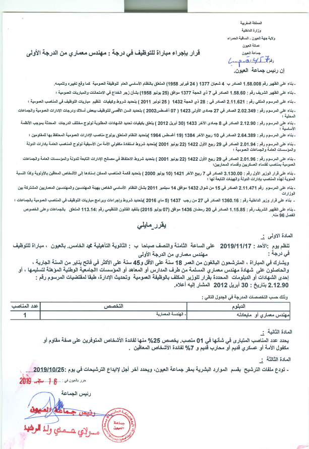 Alwadifa ingenieur / Alwadifa Laayoune / Alwadifa Maroc / Autres offres d'emploi / Emploi public / Etablissement Public / Offre d'emploi maroc / Offres d'emploi ingenieur / Par fonction / Par ville / Type جماعة العيون إقليم العيون مباراة لتوظيف مهندس معماري من الدرجة الأولى آخر أجل 25 اكتوبر 2019 ShareSharePin It جماعة العيون إقليم العيون مباراة لتوظيف مهندس معماري من الدرجة الأولى آخر أجل 25 اكتوبر 2019