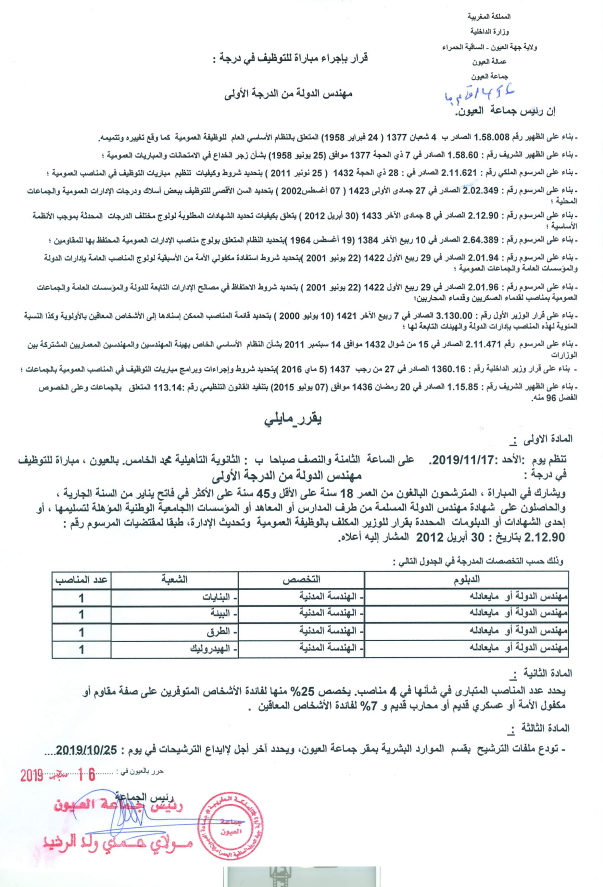 Alwadifa ingenieur / Alwadifa Laayoune / Alwadifa Maroc / Autres offres d'emploi / Emploi public / Etablissement Public / Offre d'emploi maroc / Offres d'emploi ingenieur / Par fonction / Par ville / Type جماعة العيون إقليم العيون مباراة لتوظيف 04 مهندسي دولة من الدرجة الأولى آخر أجل 25 اكتوبر 2019 ShareSharePin It جماعة العيون إقليم العيون مباراة لتوظيف 04 مهندسي دولة من الدرجة الأولى آخر أجل 25 اكتوبر 2019