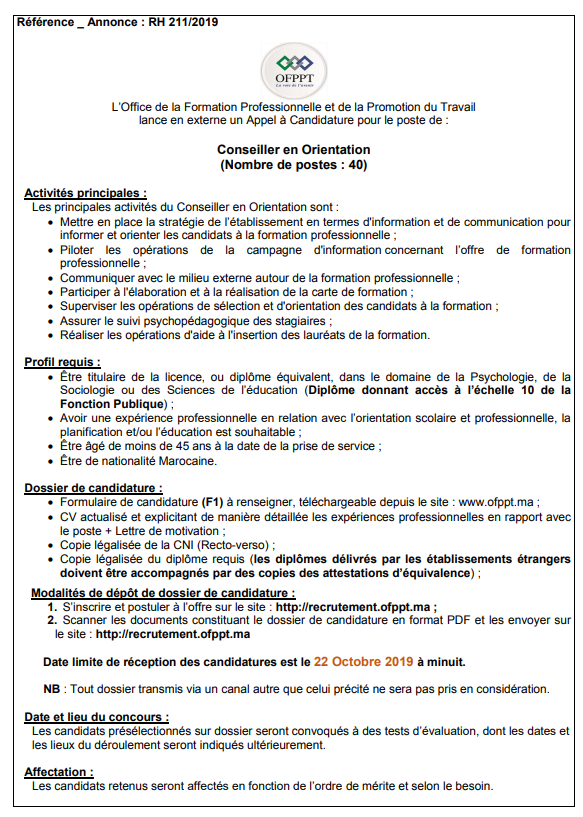 Alwadifa licence / Alwadifa Maroc / Alwadifa tout le Maroc / Autres offres d'emploi / Emploi public / Offre d'emploi maroc / Offres d'emploi Licence / Offres d'emploi OFPPT / Par fonction / Par ville / Type مكتب التكوين المهني وإنعاش الشغل مباراة لتوظيف 40 مستشار في التوجيه آخر أجل 22 اكتوبر 2019 ShareSharePin It مكتب التكوين المهني وإنعاش الشغل مباراة لتوظيف 40 مستشار في التوجيه آخر أجل 22 اكتوبر 2019