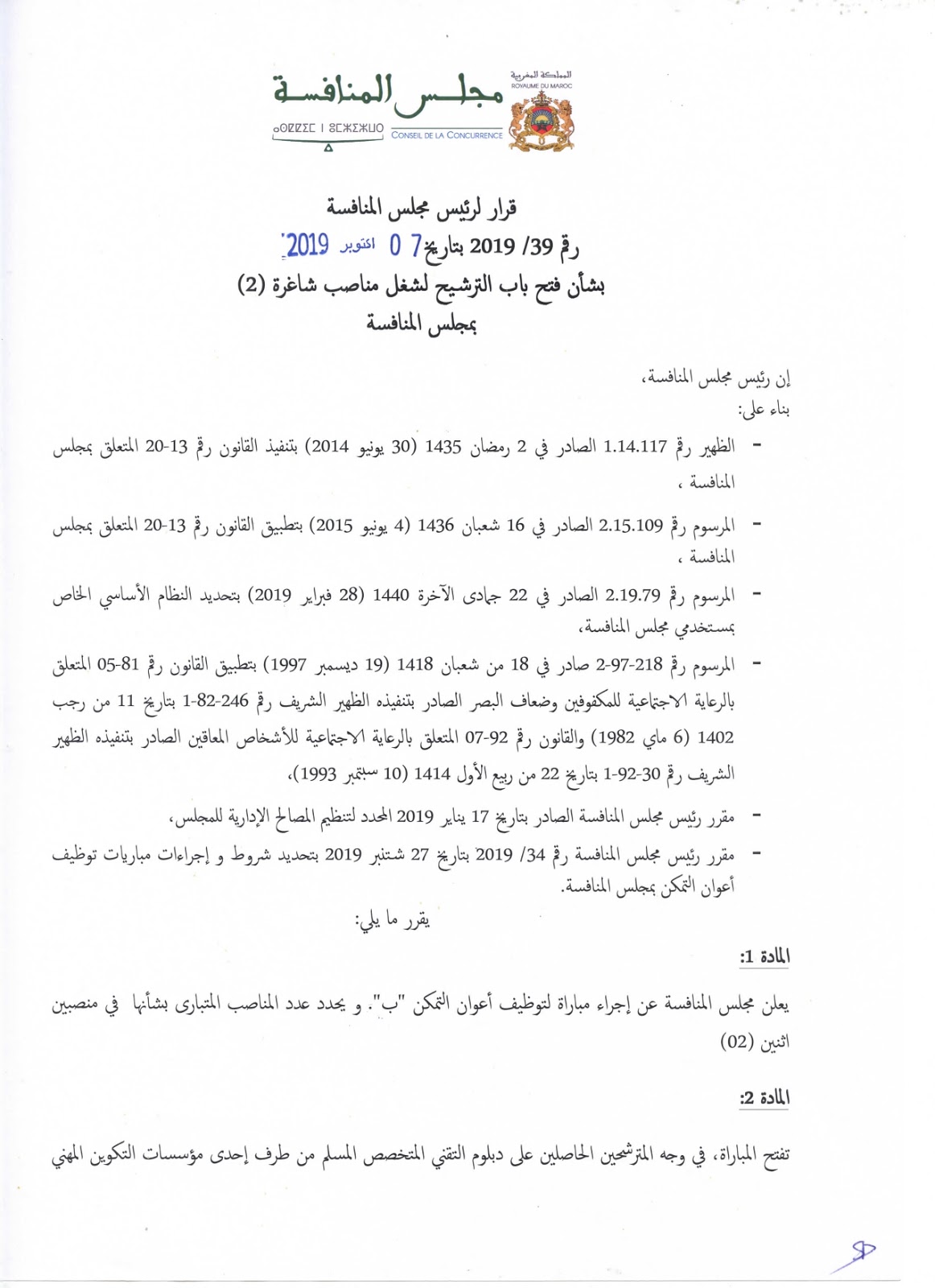 Alwadifa Maroc / Alwadifa tout le Maroc / Emploi diplomés / Emploi public / Etablissement Public / Offre d'emploi maroc / Par fonction / Par ville / Type مجلس المنافسة مباراة لتوظيف 02 أعوان التمكن آخر أجل 21 اكتوبر 2019 ShareSharePin It مجلس المنافسة مباراة لتوظيف 02 أعوان التمكن آخر أجل 21 اكتوبر 2019