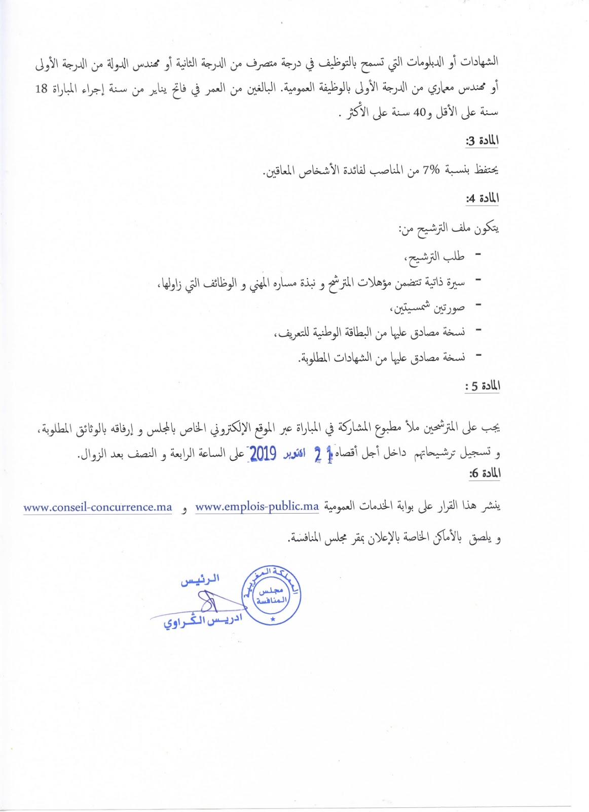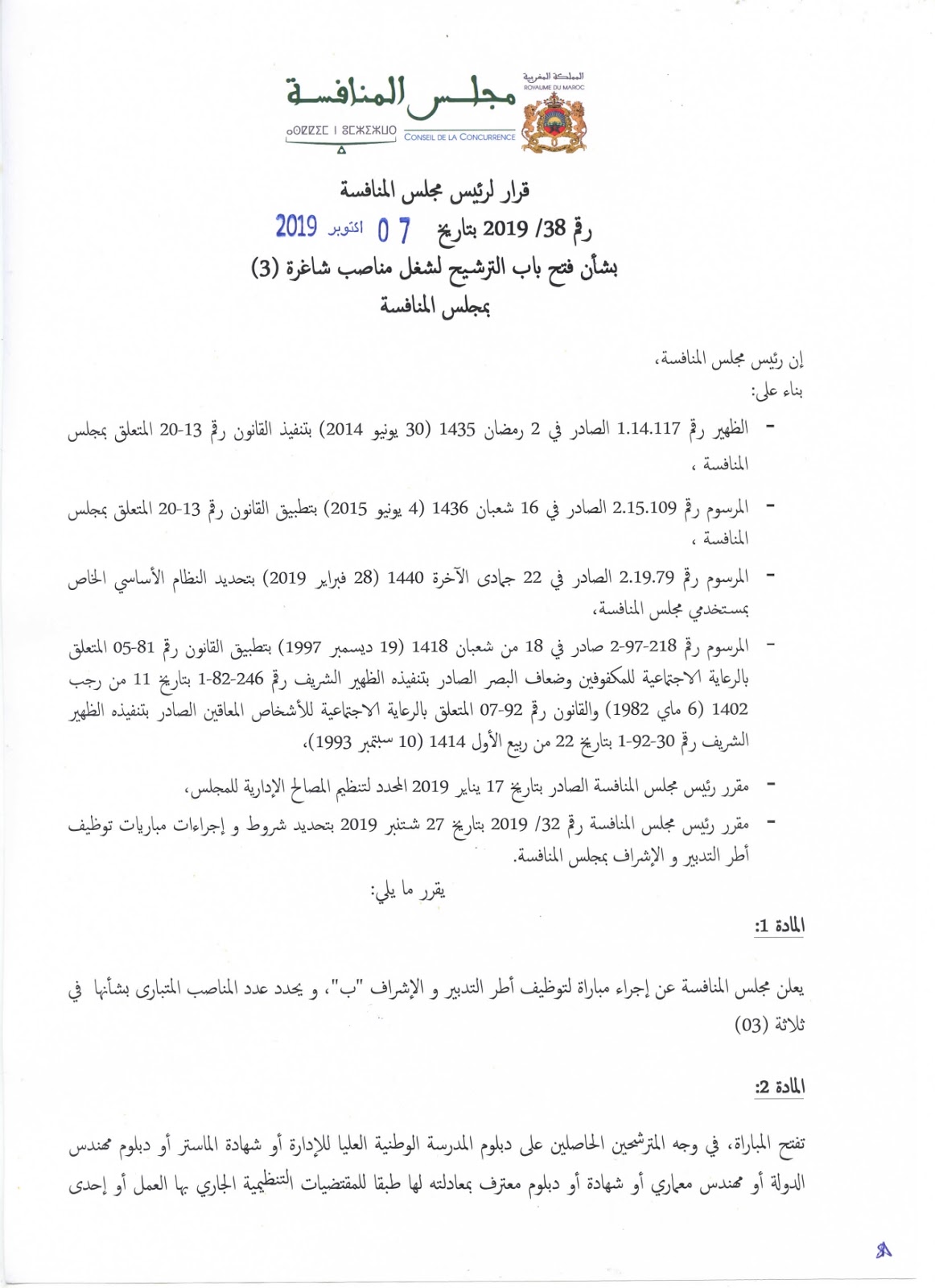 Alwadifa ingenieur / Alwadifa Maroc / Alwadifa master / Alwadifa tout le Maroc / Autres offres d'emploi / Emploi public / Etablissement Public / Offre d'emploi maroc / Offres d'emploi ingenieur / Offres d'emploi master / Par fonction / Par ville / Type مجلس المنافسة مباراة لتوظيف 03 أطر التدبير و الإشراف أجل 21 اكتوبر 2019 ShareSharePin It مجلس المنافسة مباراة لتوظيف 03 أطر التدبير و الإشراف أجل 21 اكتوبر 2019