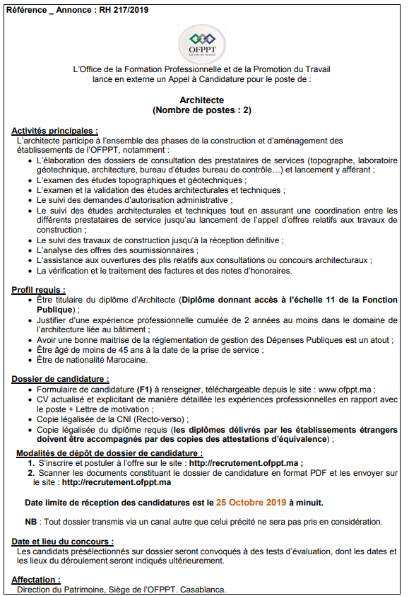 Alwadifa ingenieur / Alwadifa Maroc / Alwadifa tout le Maroc / Autres offres d'emploi / Emploi public / Offre d'emploi maroc / Offres d'emploi ingenieur / Offres d'emploi OFPPT / Par fonction / Par ville / Type مكتب التكوين المهني وإنعاش الشغل مباراة لتوظيف 02 مهندسين معماريين آخر أجل 25 اكتوبر 2019 ShareSharePin It مكتب التكوين المهني وإنعاش الشغل مباراة لتوظيف 02 مهندسين معماريين آخر أجل 25 اكتوبر 2019