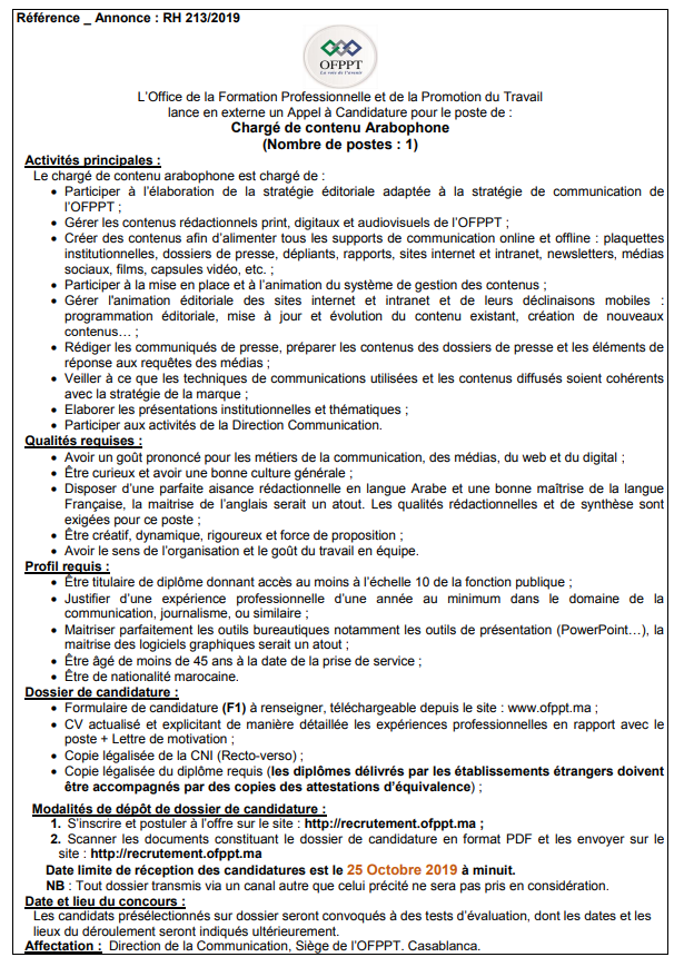 Alwadifa licence / Alwadifa Maroc / Alwadifa tout le Maroc / Autres offres d'emploi / Emploi public / Offre d'emploi maroc / Offres d'emploi Licence / Offres d'emploi OFPPT / Par fonction / Par ville / Type مكتب التكوين المهني وإنعاش الشغل مباراة لتوظيف 01 مكلف بالمحتوى لغة عربية آخر أجل 25 اكتوبر 2019 ShareSharePin It مكتب التكوين المهني وإنعاش الشغل مباراة لتوظيف 01 مكلف بالمحتوى لغة عربية آخر أجل 25 اكتوبر 2019