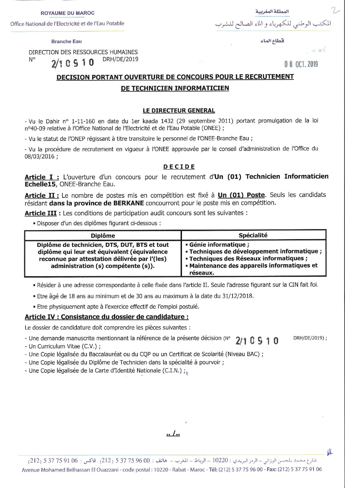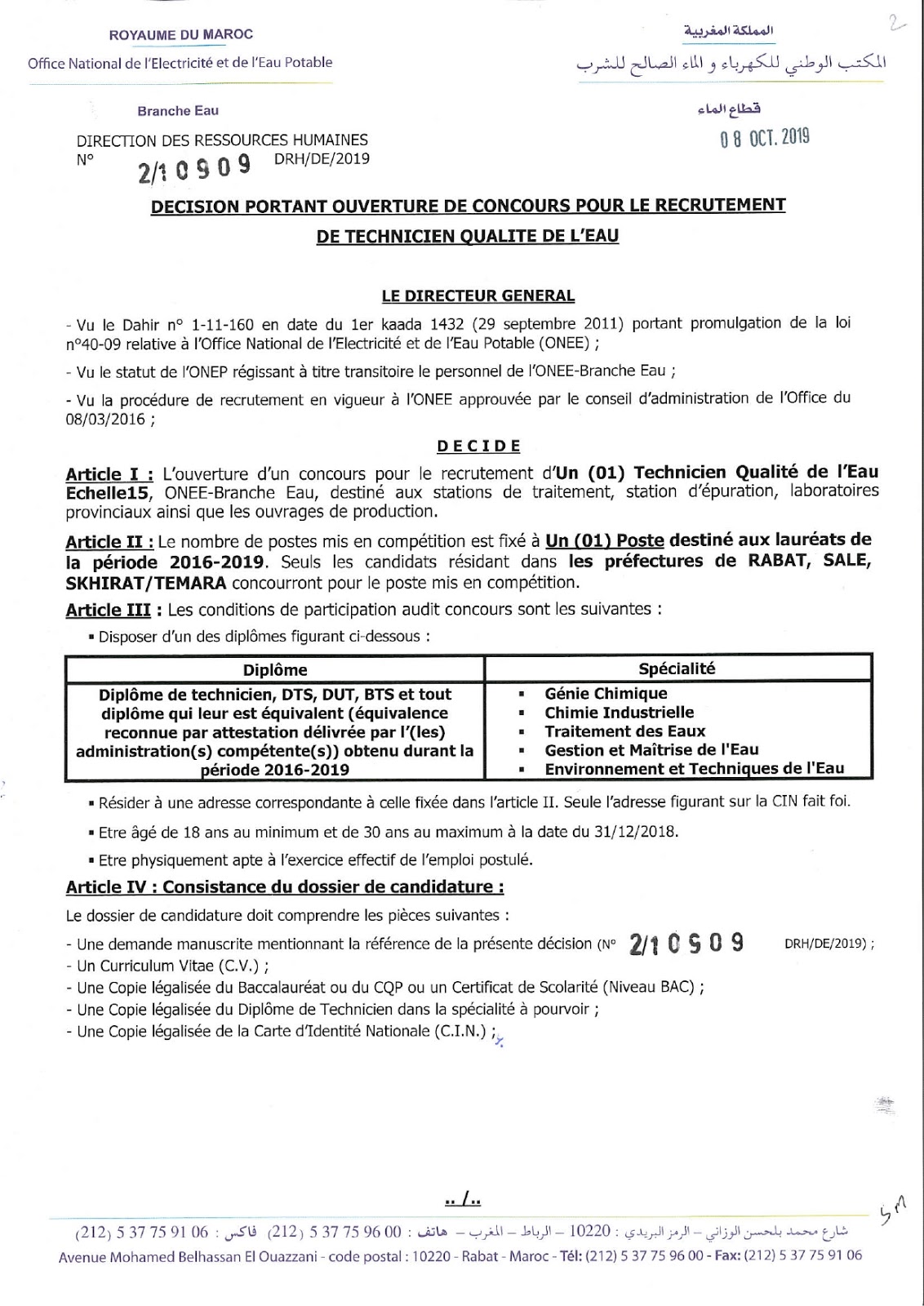 Alwadifa Maroc / Alwadifa technicien / Alwadifa tout le Maroc / Autres offres d'emploi / Emploi diplomés / Emploi public / Offre d'emploi maroc / Offres d'emploi ONEP / Offres d'emploi technicien / Par fonction / Par ville / Type المكتب الوطني للكهرباء والماء الصالح للشرب – قطاع الماء مباراة لتوظيف 02 تقنيين آخر أجل 31 اكتوبر 2019 ShareSharePin It المكتب الوطني للكهرباء والماء الصالح للشرب – قطاع الماء مباراة لتوظيف 02 تقنيين آخر أجل 31 اكتوبر 2019 ****