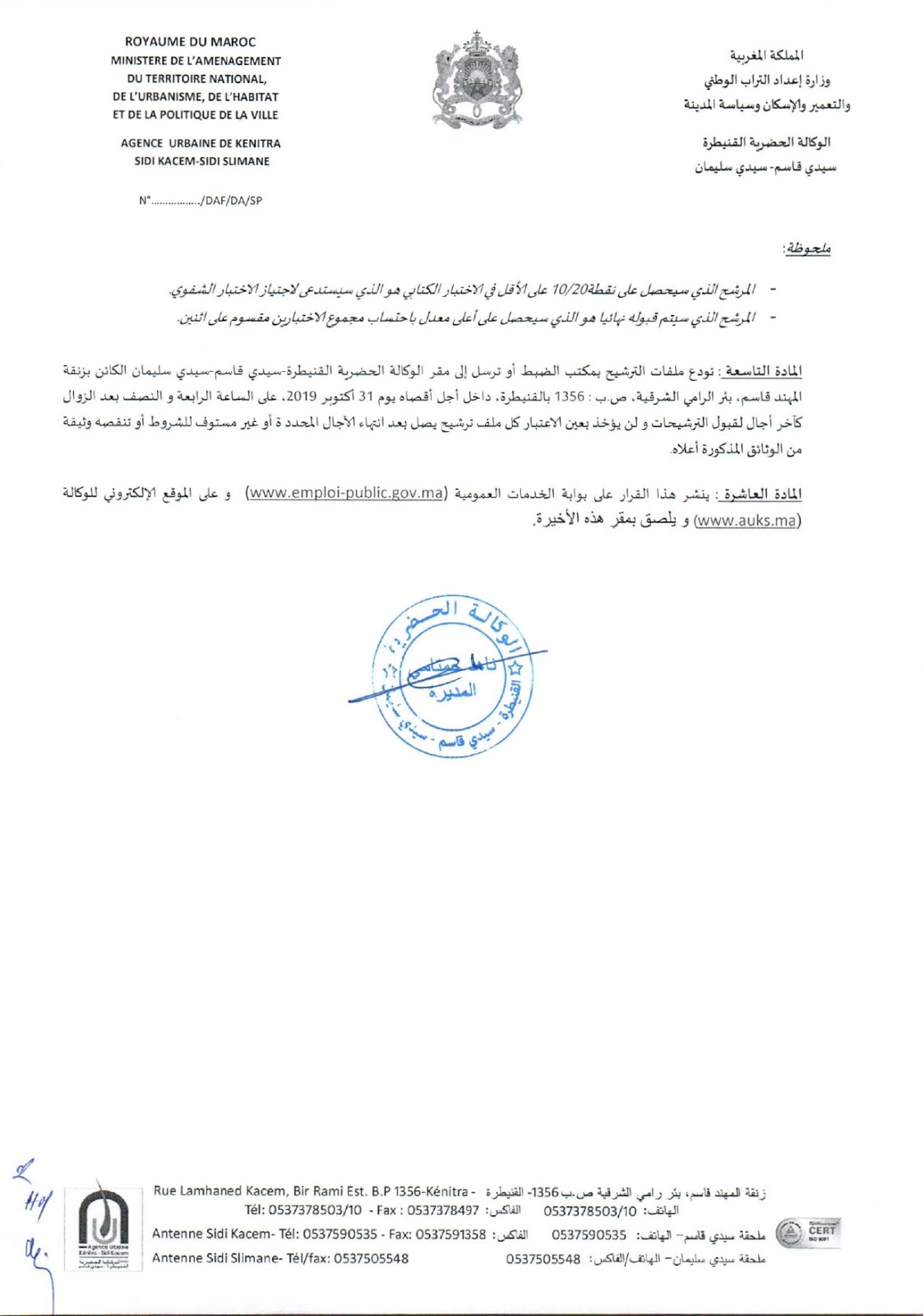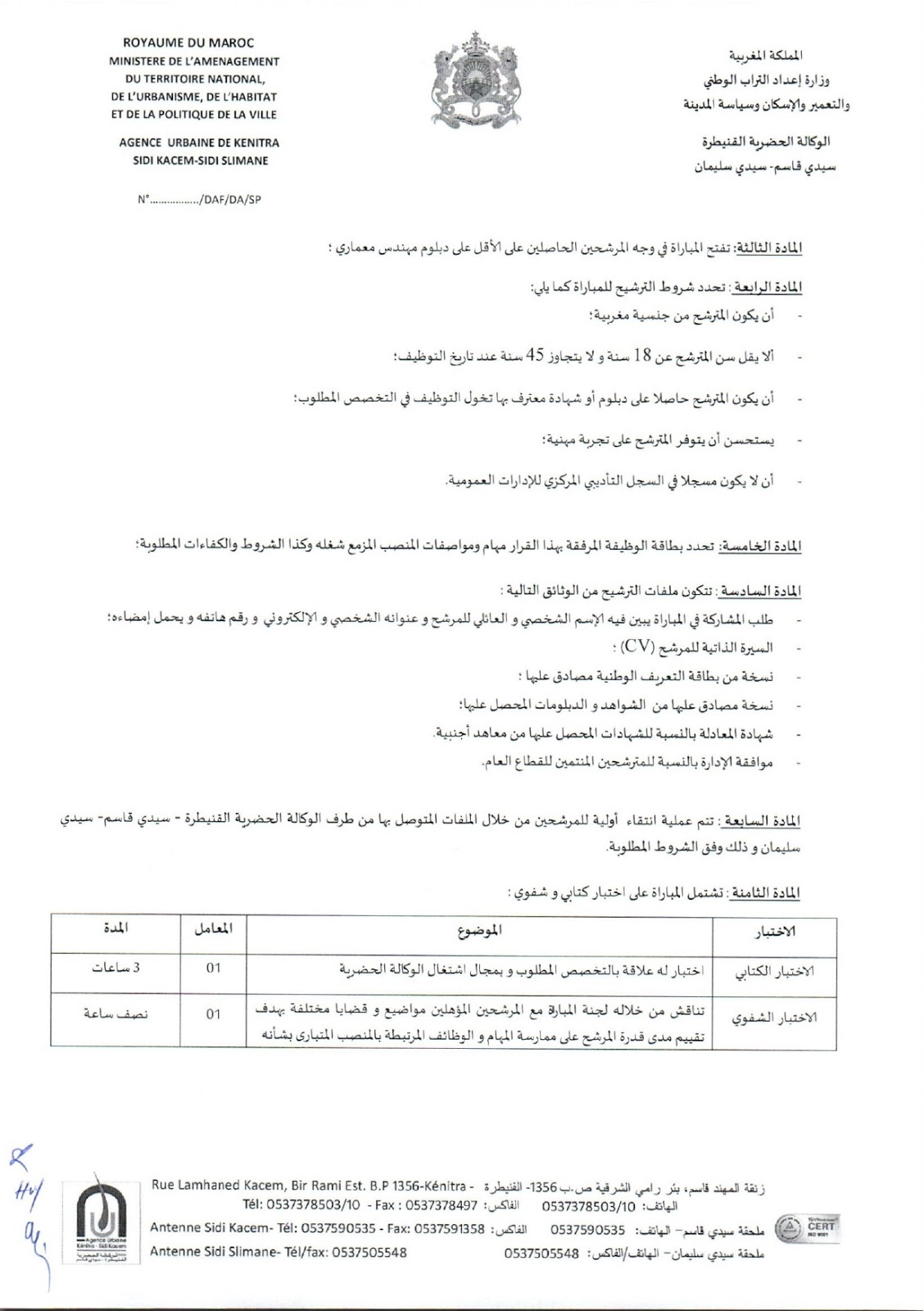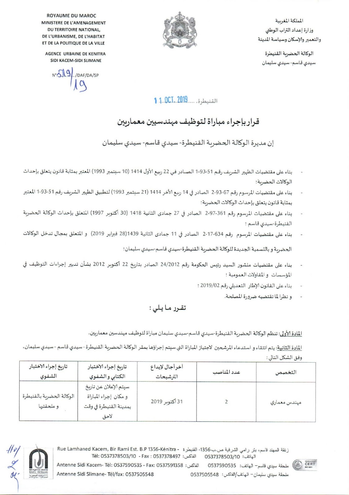 Alwadifa ingenieur / Alwadifa Kénitra / Alwadifa Maroc / Autres offres d'emploi / Emploi public / Etablissement Public / Offre d'emploi maroc / Offres d'emploi ingenieur / Par fonction / Par ville / Type الوكالة الحضرية القنيطرة – سيدي قاسم مباراة لتوظيف 02 مهندسين معماريين آخر أجل 31 اكتوبر 2019 ShareSharePin It الوكالة الحضرية القنيطرة – سيدي قاسم مباراة لتوظيف 02 مهندسين معماريين آخر أجل 31 اكتوبر 2019