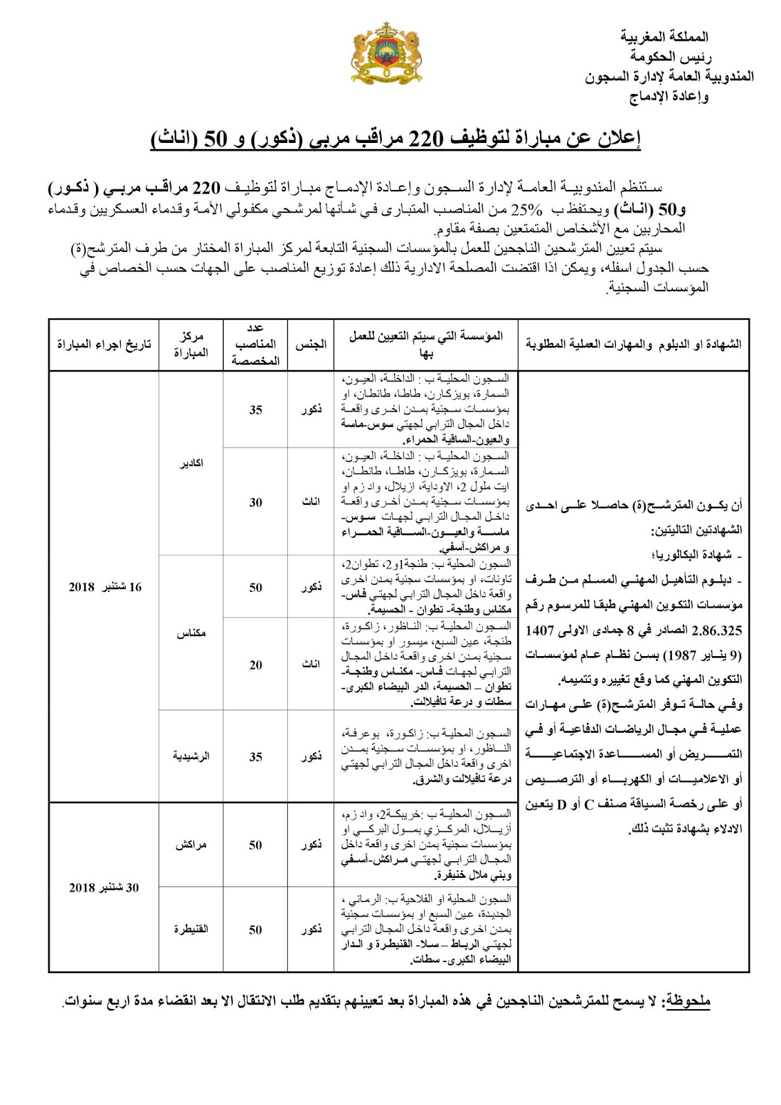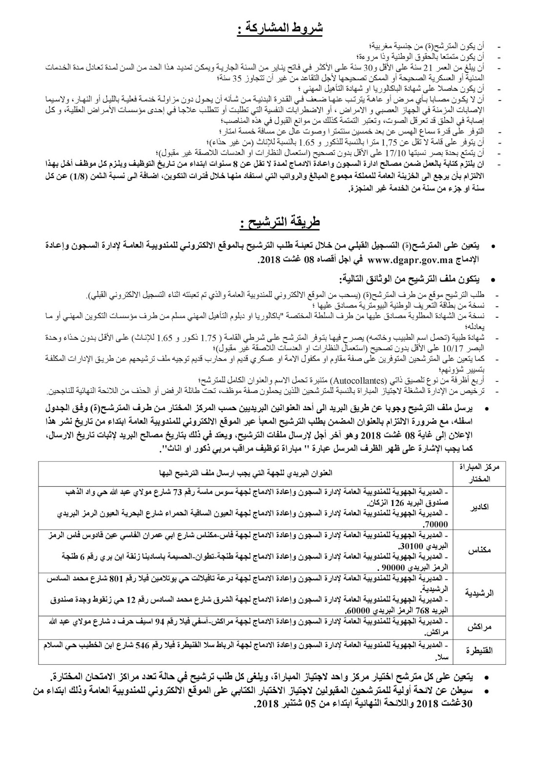 Alwadifa Maroc / Autres offres d'emploi / Emploi news / Emploi public / Offre d'emploi maroc شروط توظيف حراس السجن إناث كمراقبات مربيات للراغبات في تقديم المساعدة الاجتماعية للسجينات 2018 ShareSharePin It شروط توظيف حراس السجن إناث كمراقبات مربيات للراغبات في تقديم المساعدة الاجتماعية للسجينات 2018