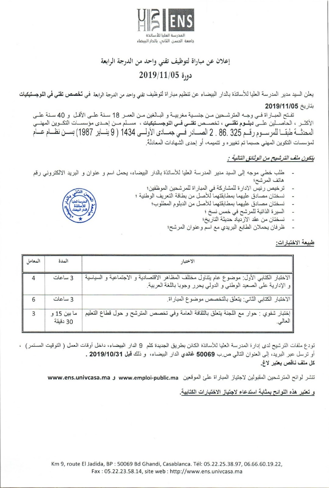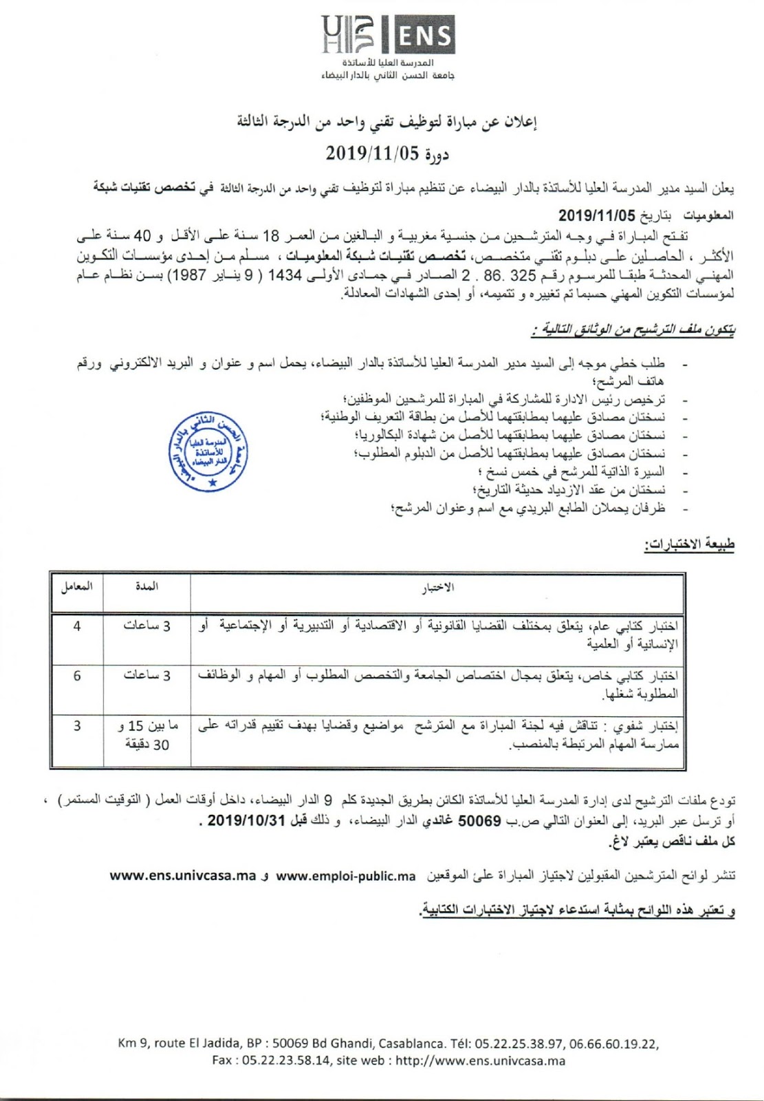 Alwadifa Casablanca / Alwadifa Maroc / Alwadifa technicien / Autres offres d'emploi / Emploi public / Etablissement Public / Offre d'emploi maroc / Offre d'emploi maroc / Offre d’emploi Casablanca / Offres d'emploi technicien / Par fonction / Par ville / Type المدرسة العليا للاساتذة الدار البيضاء مباراة لتوظيف 02 تقنيين من الدرجة الثالثة آخر أجل 30 اكتوبر 2019 ShareSharePin It المدرسة العليا للاساتذة الدار البيضاء مباراة لتوظيف 02 تقنيين من الدرجة الثالثة آخر أجل 30 اكتوبر 2019