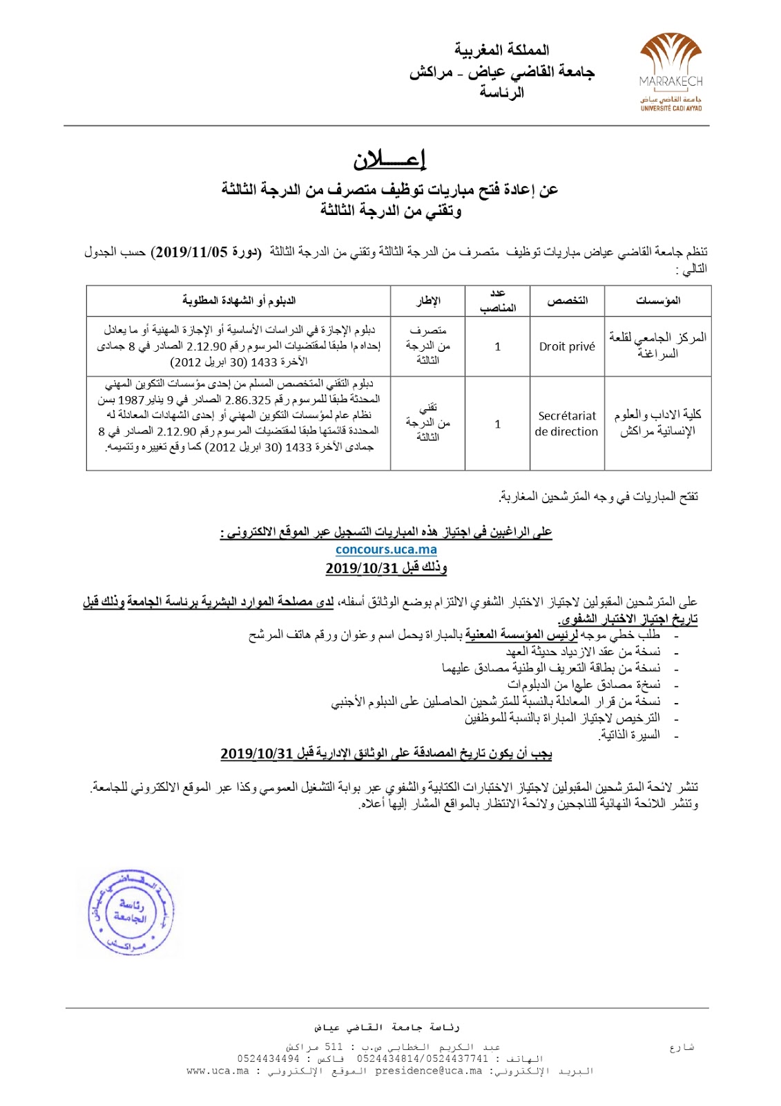 Alwadifa licence / Alwadifa Maroc / Alwadifa Marrakech / Alwadifa master / Autres offres d'emploi / Emploi public / Etablissement Public / Offre d'emploi maroc / Offres d'emploi Licence / Offres d'emploi master / Par fonction / Par ville / Type جامعة القاضي عياض مباراة لتوظيف 01 متصرف و01 تقني من الدرجة الثالثة آخر أجل 31 اكتوبر 2019 ShareSharePin It جامعة القاضي عياض مباراة لتوظيف 01 متصرف و01 تقني من الدرجة الثالثة آخر أجل 31 اكتوبر 2019