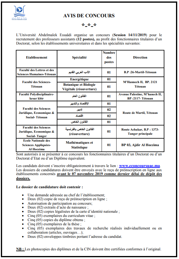 Alwadifa doctorat / Alwadifa Maroc / Alwadifa Tetouan / Autres offres d'emploi / Emploi public / Etablissement Public / Offre d'emploi maroc / Offres d'emploi doctorat / Par fonction / Par ville / Type جامعة عبد المالك السعدي – تطوان مباراة توظيف 12 أستاذ التعليم العالي مساعد آخر أجل 7 نونبر 2019 ShareSharePin It جامعة عبد المالك السعدي – تطوان مباراة توظيف 12 أستاذ التعليم العالي مساعد آخر أجل 7 نونبر 2019 رابط التسجيل