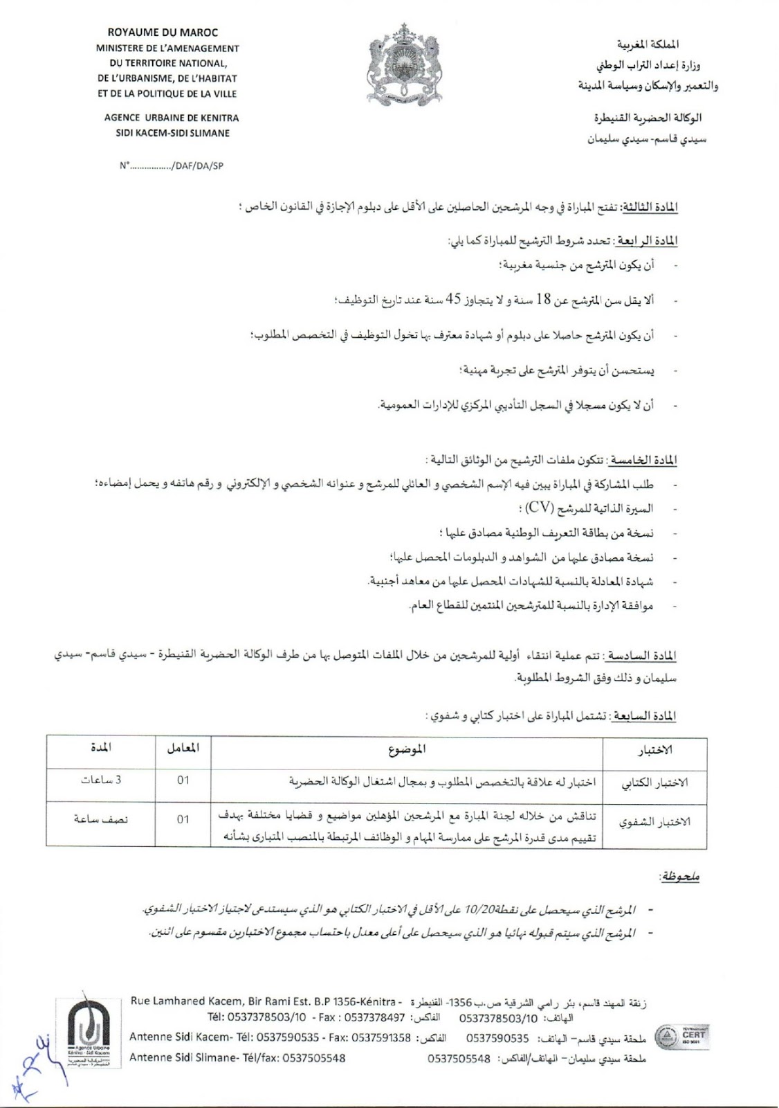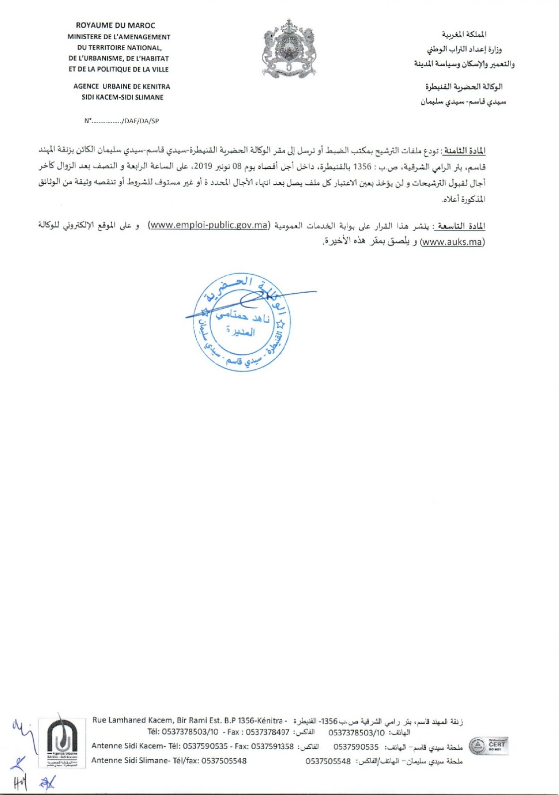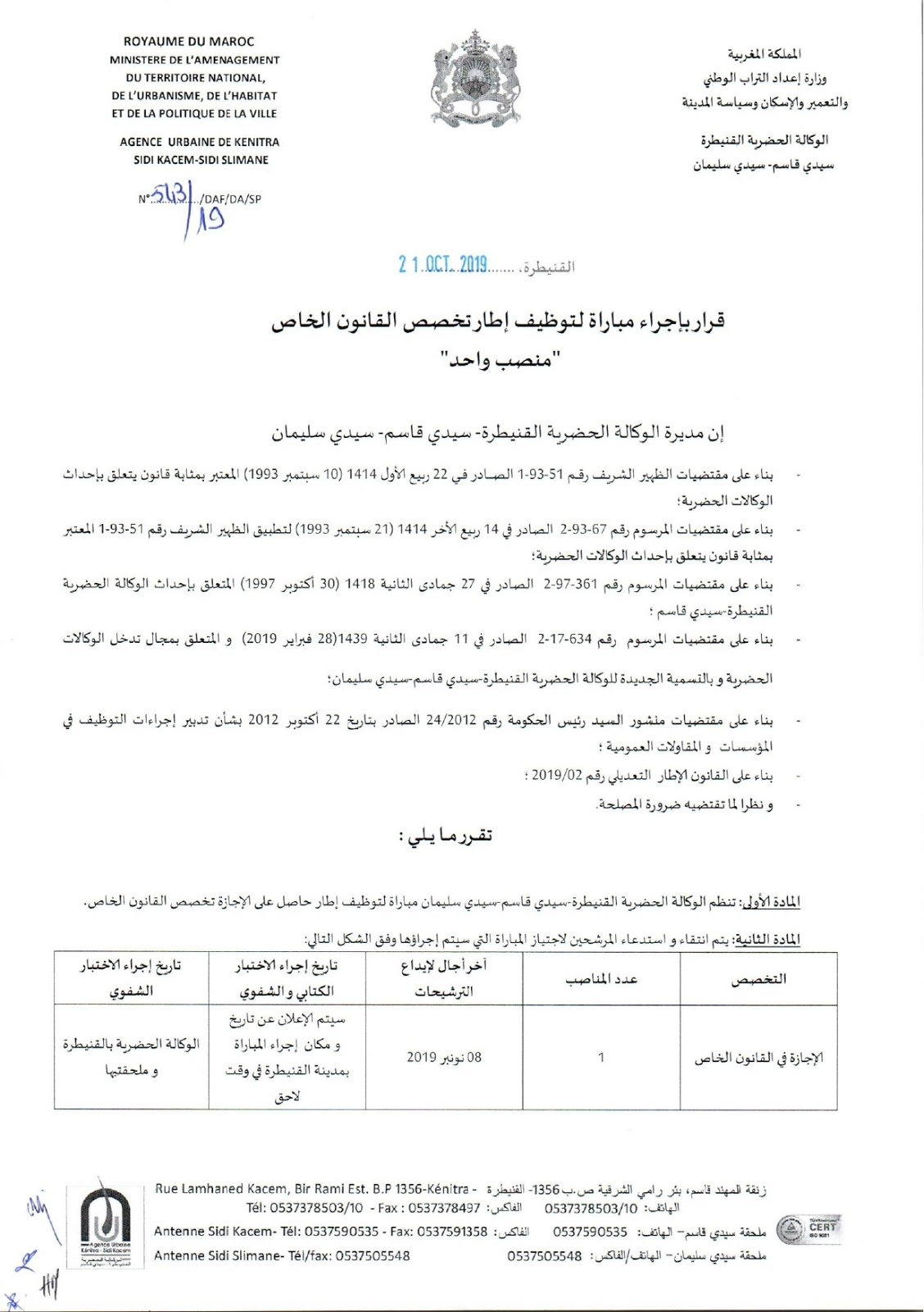 Alwadifa Kénitra / Alwadifa licence / Alwadifa Maroc / Autres offres d'emploi / Emploi public / Etablissement Public / Offre d'emploi maroc / Offres d'emploi Licence / Par fonction / Par ville / Type الوكالة الحضرية القنيطرة – سيدي قاسم مباراة لتوظيف 01 إطار تخصص القانون الخاص آخر أجل 8 نونبر 2019 ShareSharePin It الوكالة الحضرية القنيطرة – سيدي قاسم مباراة لتوظيف 01 إطار تخصص القانون الخاص آخر أجل 8 نونبر 2019