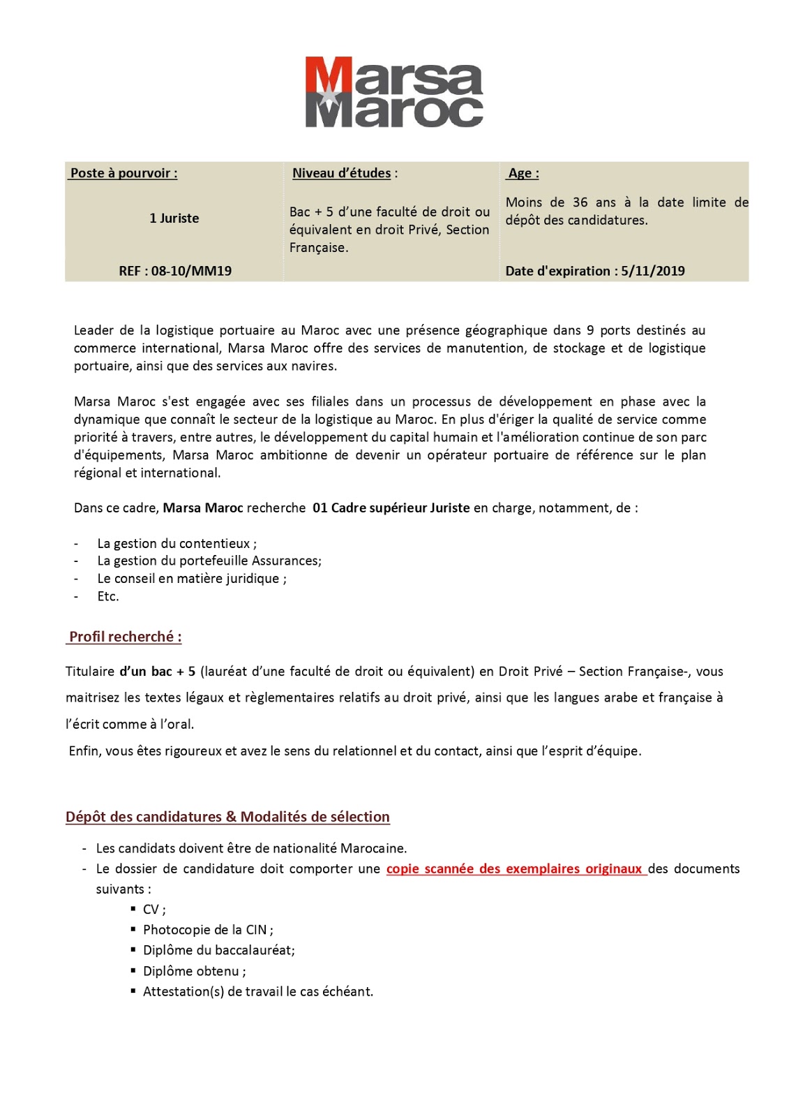 Alwadifa Maroc / Alwadifa tout le Maroc / Emploi public / Marsa Maroc / Offre d'emploi maroc / Offres d'emploi Bac + 5 / Par fonction / Par ville / Type شركة استغلال الموانئ مرسى ماروك مباراة لتوظيف 01 إطار قانوني آخر أجل 5 نونبر 2019 ShareSharePin It شركة استغلال الموانئ مرسى ماروك مباراة لتوظيف 01 إطار قانوني آخر أجل 5 نونبر 2019 رابط الترشيح
