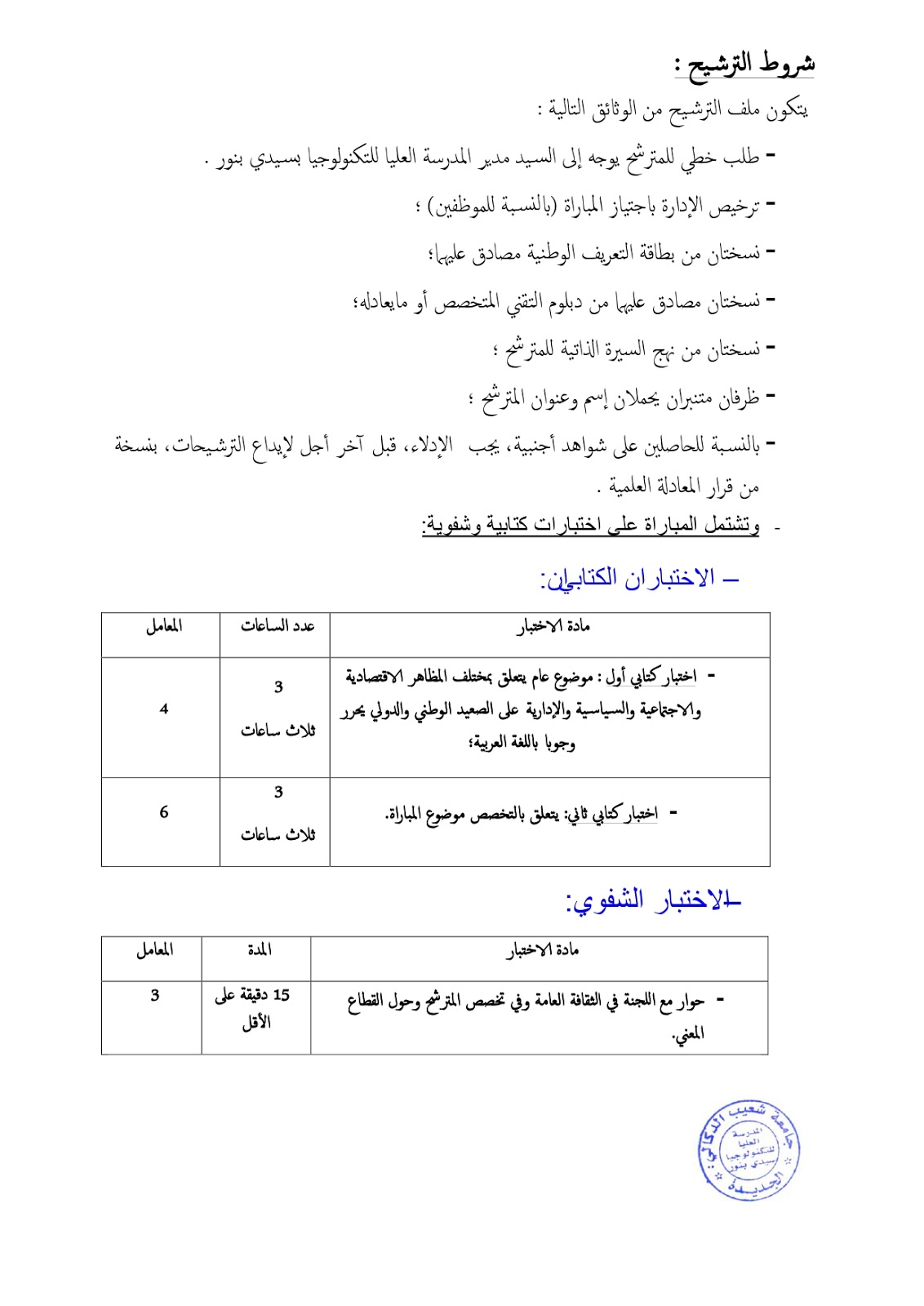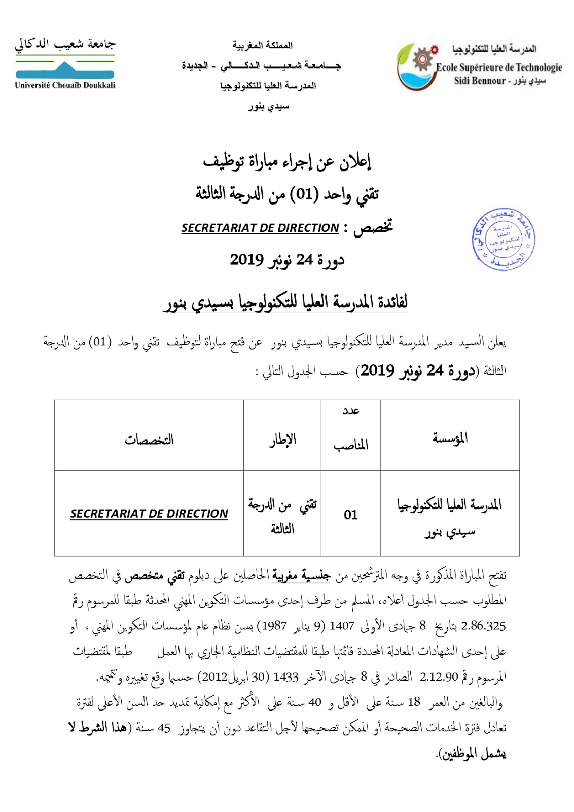 Alwadifa Maroc / Alwadifa technicien / Autres offres d'emploi / Emploi public / Etablissement Public / Offre d'emploi maroc / Offres d'emploi technicien / Par fonction / Type المدرسة العليا للتكنولوجيا سيدي بنور مباراة توظيف 01 تقني من الدرجة الثالثة آخر أجل 18 نونبر 2019 ShareSharePin It المدرسة العليا للتكنولوجيا سيدي بنور مباراة توظيف 01 تقني من الدرجة الثالثة آخر أجل 18 نونبر 2019