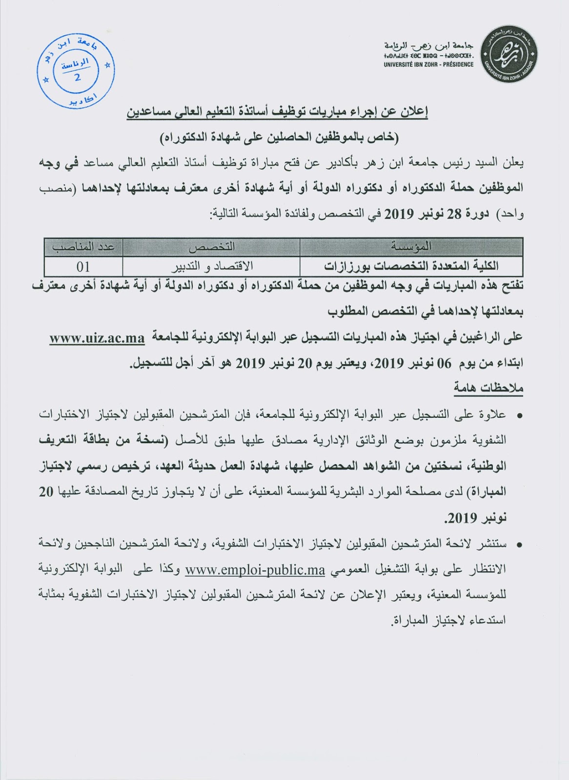 Alwadifa doctorat / Alwadifa Maroc / Alwadifa Ouarzazate / Autres offres d'emploi / Emploi public / Etablissement Public / Offre d'emploi maroc / Offres d'emploi doctorat / Par fonction / Par ville / Type الكلية المتعددة التخصصات بورزازات مباراة توظيف 01 أستاذ التعليم العالي مساعد آخر أجل 20 نونبر 2019 ShareSharePin It الكلية المتعددة التخصصات بورزازات مباراة توظيف 01 أستاذ التعليم العالي مساعد آخر أجل 20 نونبر 2019