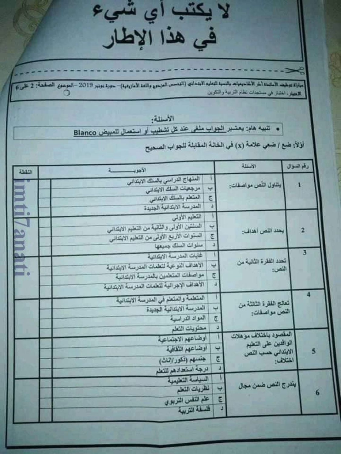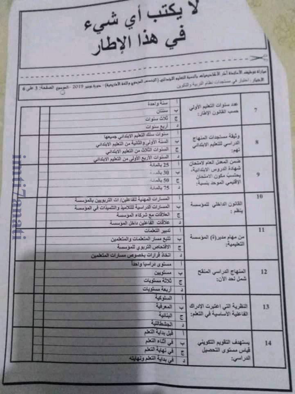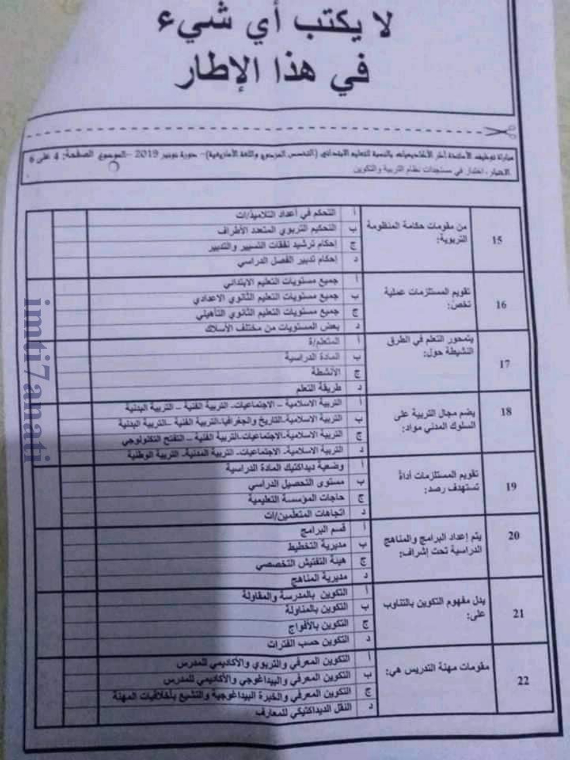 Alwadifa Maroc / Autres offres d'emploi / Emploi public / Modèles d'examen / Offre d'emploi maroc الاختبار الكتابي في مادة مستجدات التربية و التكوين – سلك الابتدائي دورة نونبر 2019 ShareSharePin It الاختبار الكتابي في مادة مستجدات التربية و التكوين – سلك الابتدائي دورة نونبر 2019