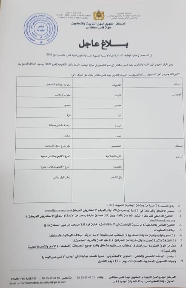 Alwadifa Fes / Alwadifa Maroc / Alwadifa Meknes / Alwadifa TAALIM / Autres offres d'emploi / Emploi public / Offre d'emploi maroc / Par ville بلاغ إلى الناجحين في مباراة توظيف الأساتذة أطر الأكاديمية الجهوية للتربية والتكوين لجهة فاس مكناس ShareSharePin It بلاغ إلى الناجحين في مباراة توظيف الأساتذة أطر الأكاديمية الجهوية للتربية والتكوين لجهة فاس مكناس المركز الجهوي لمهن التربية والتكوين لجهة فاس مكناس
