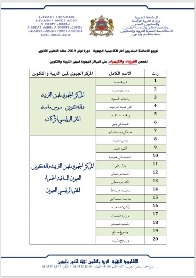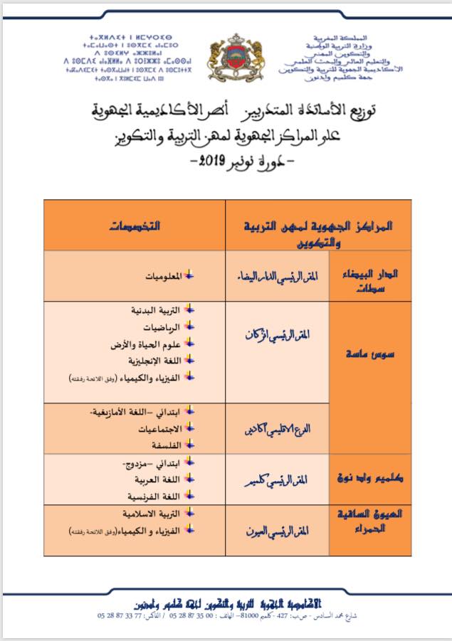 Alwadifa Guelmim / Alwadifa Maroc / Alwadifa TAALIM / Autres offres d'emploi / Emploi public / Ministère de l'éducation / Offre d'emploi maroc / Par ministere / Par ville توزيع مراكز التكوين لأطر الأكاديمية الجهوية للتربية والتكوين كلميم واد نون ShareSharePin It توزيع مراكز التكوين لأطر الأكاديمية الجهوية للتربية والتكوين كلميم واد نون