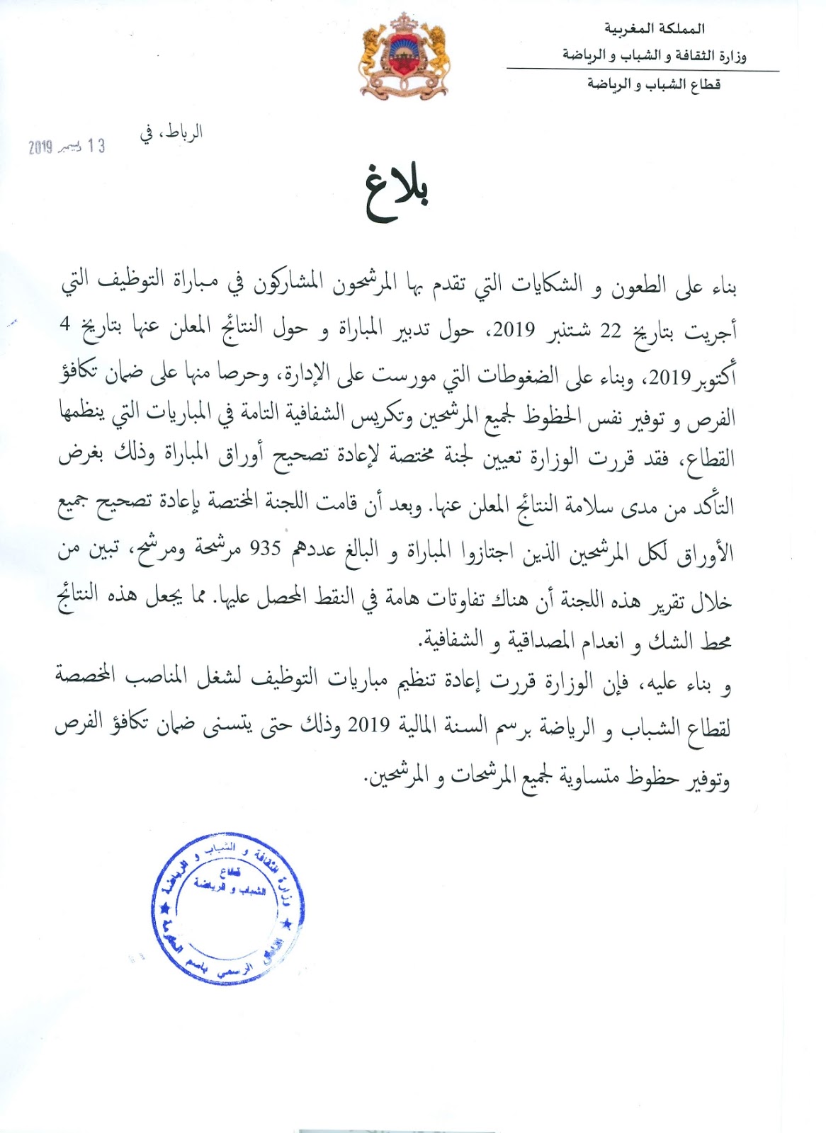 Alwadifa Maroc / Autres offres d'emploi / Emploi news / Emploi public / Ministère de la Jeunesse / Offre d'emploi maroc / Par ministere وزارة الشباب والرياضة بلاغ حول إعادة مباراة التوظيف برسم سنة 2019 ShareSharePin It وزارة الشباب والرياضة بلاغ حول إعادة مباراة التوظيف برسم سنة 2019