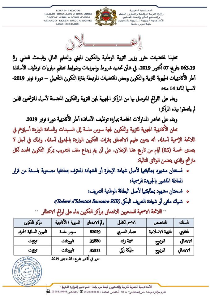 Alwadifa Agadir / Alwadifa Maroc / Alwadifa TAALIM / Autres offres d'emploi / Emploi public / Offre d'emploi maroc / Par ville / Resultats du concours الأكاديمية الجهوية للتربية والتكوين لجهة سوس ماسة لائحة الانتظار لمباراة توظيف الأساتذة أطر الأكاديميات دورة نونبر 2019 ShareSharePin It الأكاديمية الجهوية للتربية والتكوين لجهة سوس ماسة لائحة الانتظار لمباراة توظيف الأساتذة أطر الأكاديميات دورة نونبر 2019