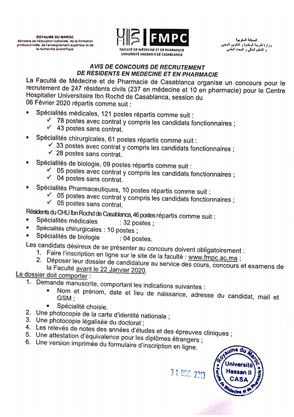 Alwadifa Casablanca / Alwadifa doctorat / Alwadifa Maroc / Autres offres d'emploi / Emploi public / Offre d'emploi maroc / Offres d'emploi doctorat / Par fonction / Par ville جامعة الحسن الثاني عين الشق – الدارالبيضاء مباراة لتوظيف مبارات توظيف 247 طبيب مقيم آخر أجل21 يناير 2020 ShareSharePin It جامعة الحسن الثاني عين الشق – الدارالبيضاء مباراة لتوظيف مبارات توظيف 247 طبيب مقيم آخر أجل21 يناير 2020