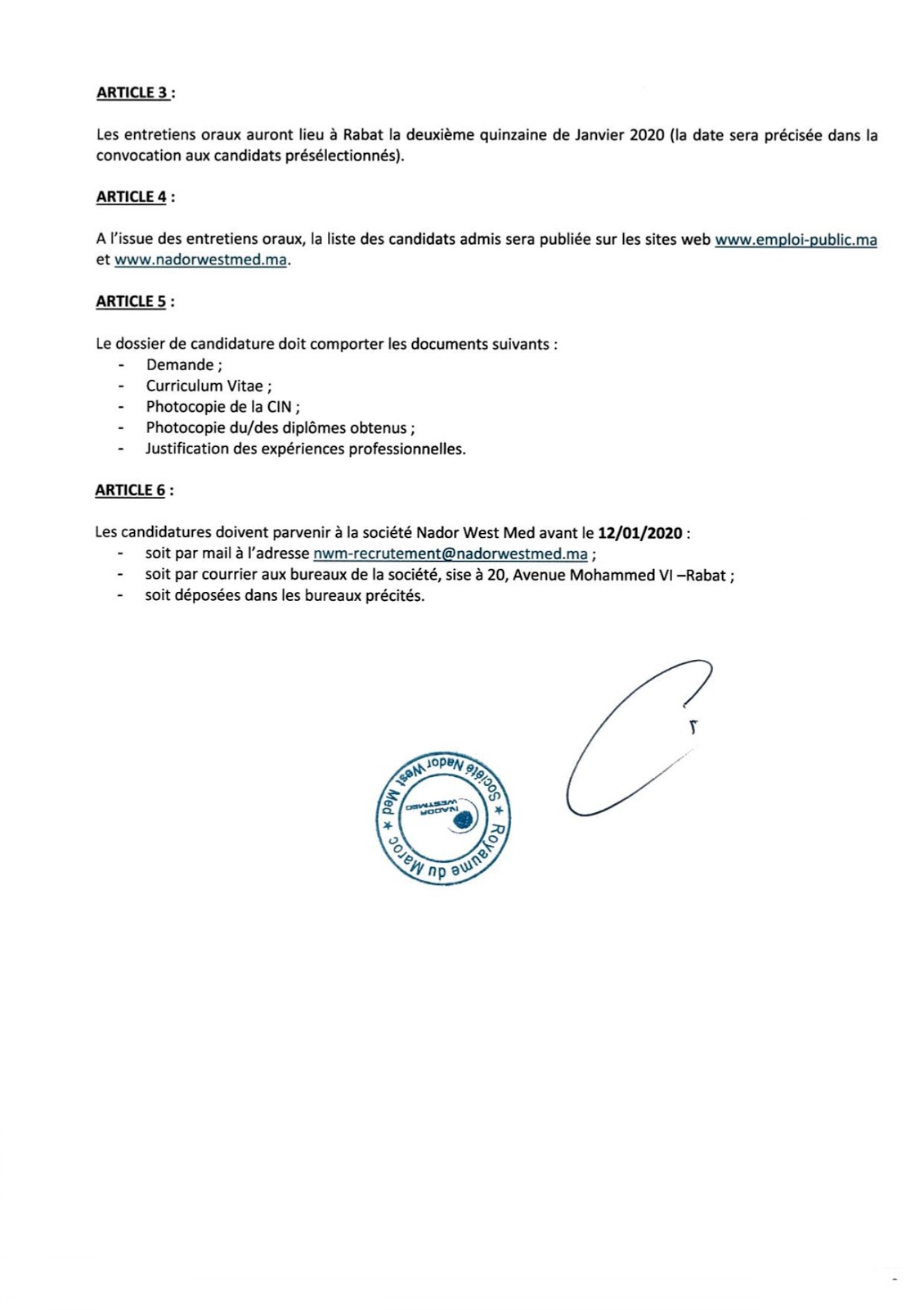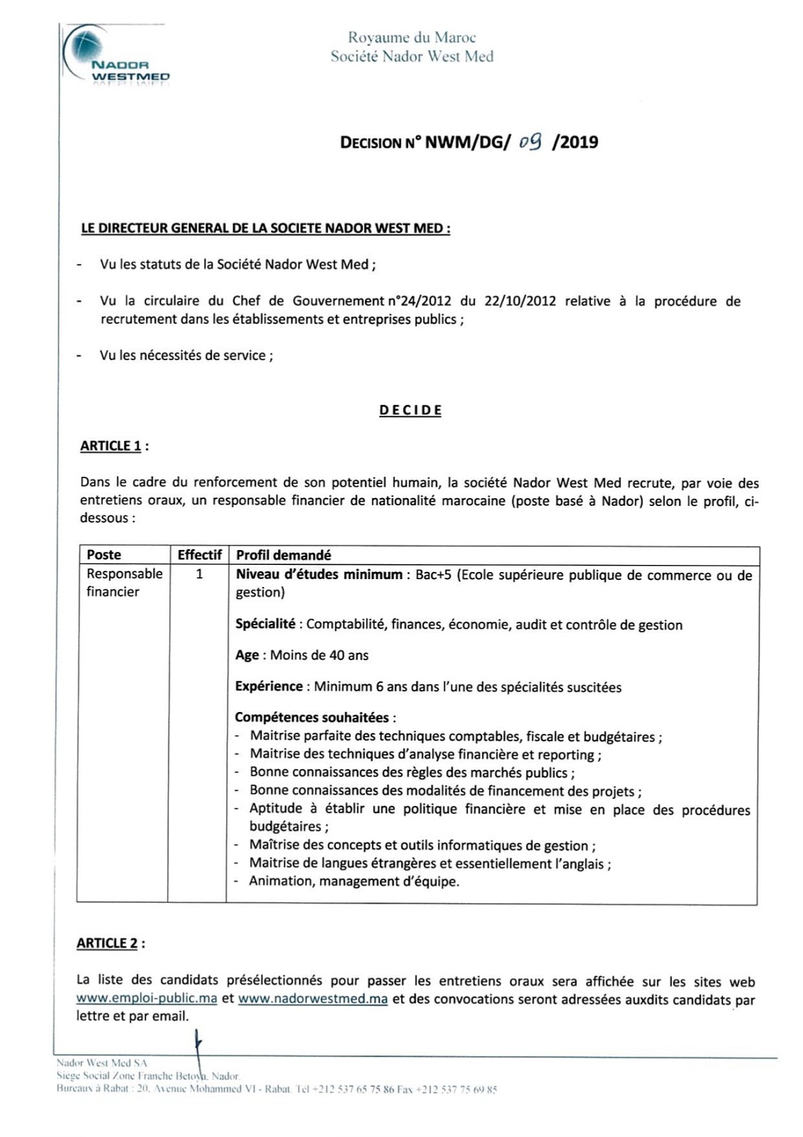 Alwadifa Maroc / Alwadifa Nador / Emploi public / Offre d'emploi maroc / Offres d'emploi Bac + 5 / Par fonction / Par ville شركة الناظور غرب المتوسط مباراة لتوظيف 01 مسؤول مالي آخر أجل 17 يناير 2020 ShareSharePin It شركة الناظور غرب المتوسط مباراة لتوظيف 01 مسؤول مالي آخر أجل 17 يناير 2020