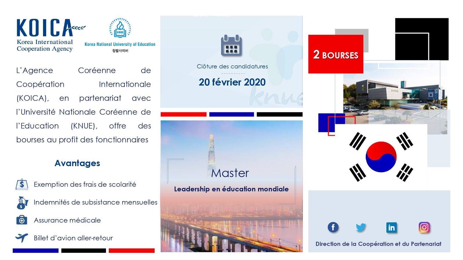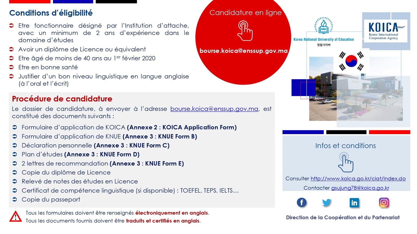 Alwadifa Maroc / Autres offres d'emploi / Bourses d'études / Emploi public / Offre d'emploi maroc منح دراسية بكوريا 2020-2021 ShareSharePin It منح دراسية بكوريا 2020-2021 Annexes Annexe I : Guide de candidature Annexe I : Descriptif du programme Annexe II : KOICA Application Form Annexe III : KNUE Application Form