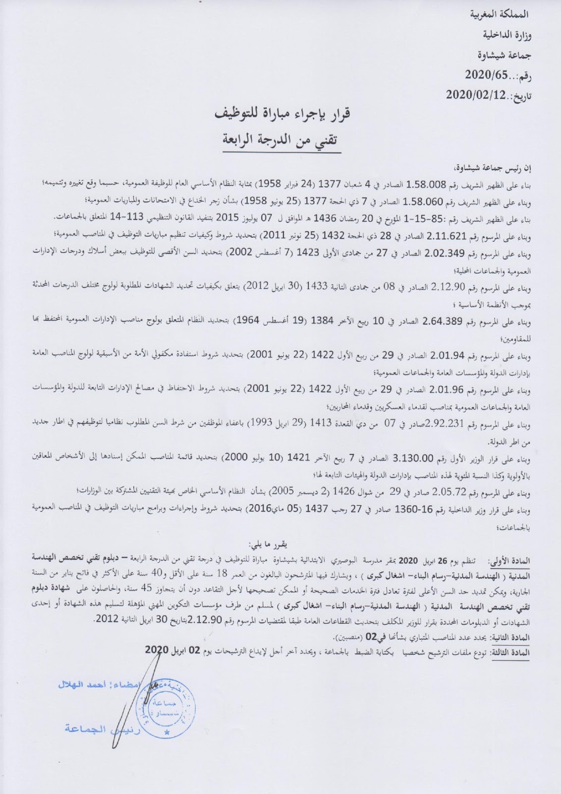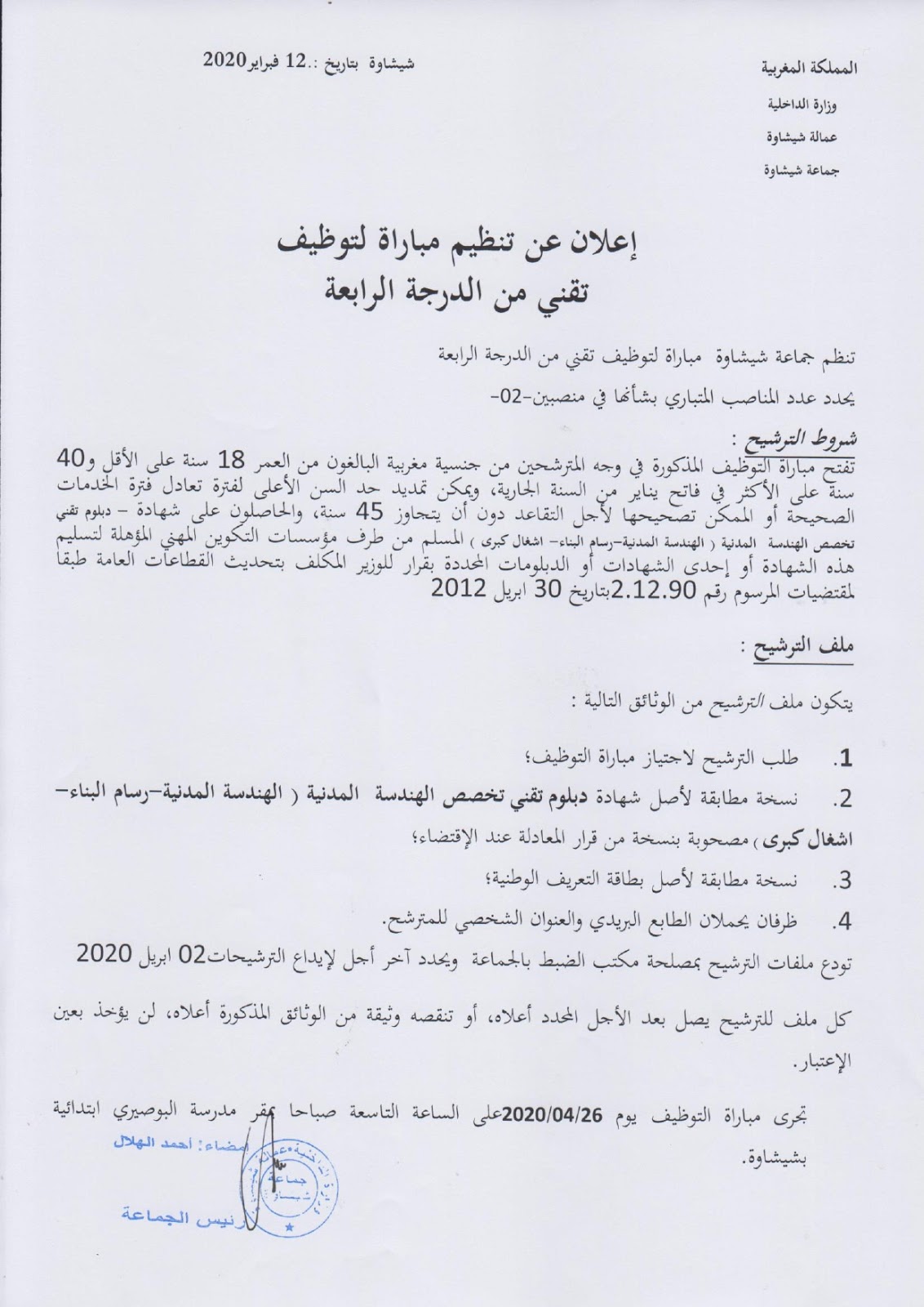 Alwadifa Maroc / Emploi diplomés / Emploi public / Offre d'emploi maroc / Par fonction جماعة شيشاوة إقليم شيشاوة مباراة لتوظيف 02 تقنيين من الدرجة الرابعة آخر أجل 2 ابريل 2020 ShareSharePin It جماعة شيشاوة إقليم شيشاوة مباراة لتوظيف 02 تقنيين من الدرجة الرابعة آخر أجل 2 ابريل 2020