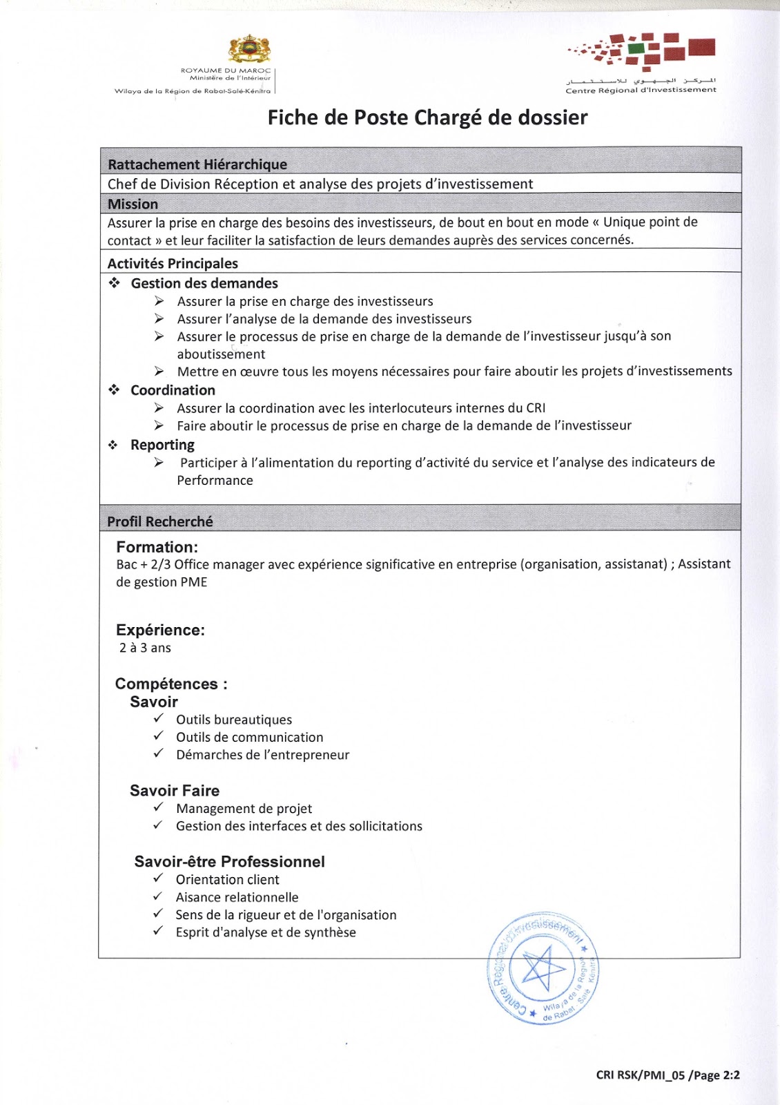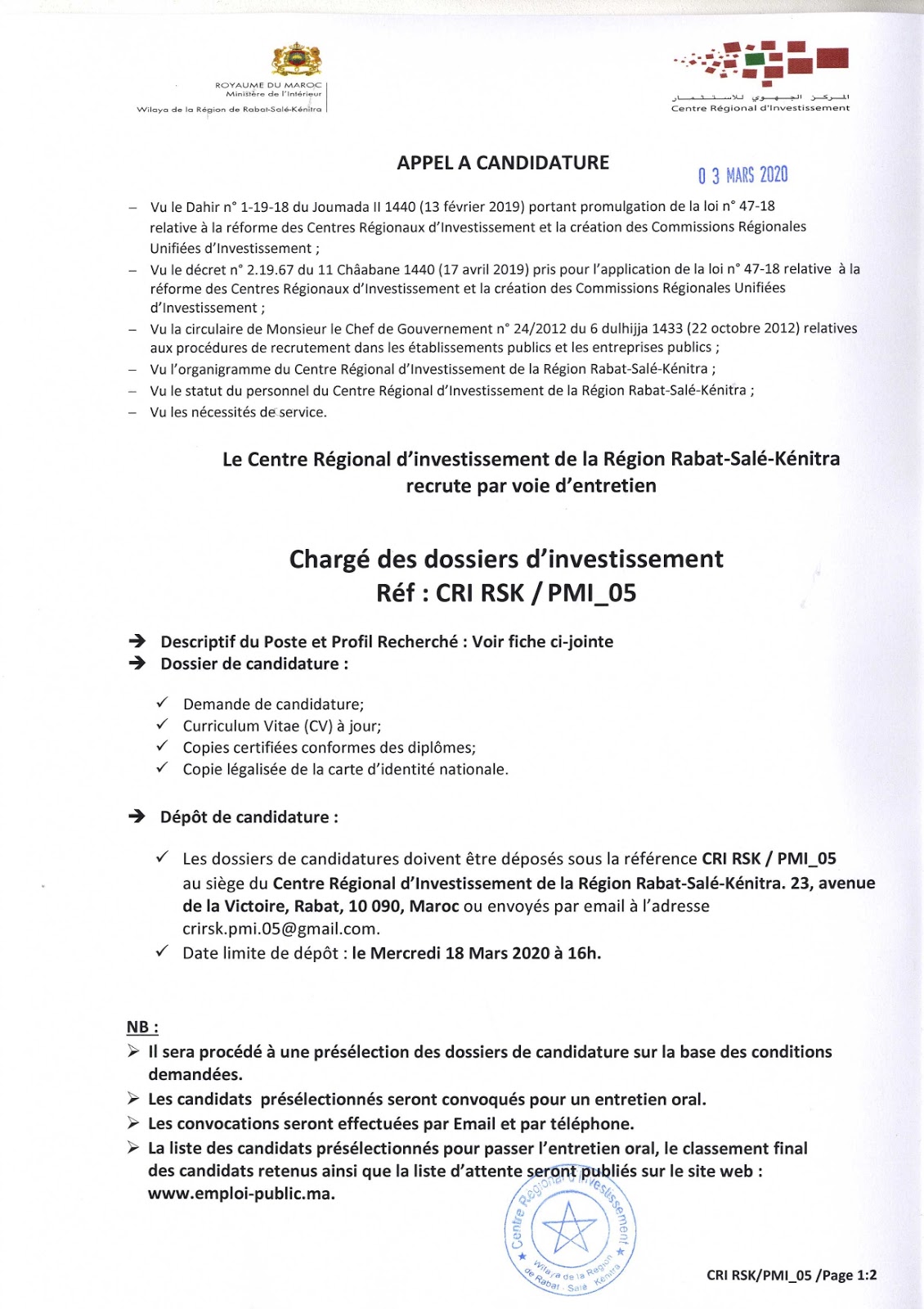 Alwadifa Maroc / Alwadifa Rabat / Alwadifa Salé / Emploi public / Offre d'emploi maroc / Offres d'emploi Bac + 2 / Offres d'emploi Bac + 3 / Par fonction / Par ville المركز الجهوي للاستثمار لجهة الرباط سلا القنيطرة مباراة لتوظيف 02 مكلفين بملفات الاستثمار آخر أجل 18 مارس 2020 ShareSharePin It المركز الجهوي للاستثمار لجهة الرباط سلا القنيطرة مباراة لتوظيف 02 مكلفين بملفات الاستثمار آخر أجل 18 مارس 2020