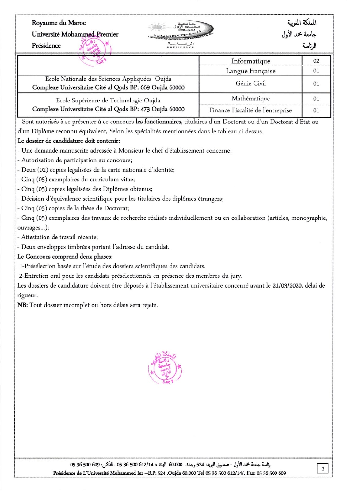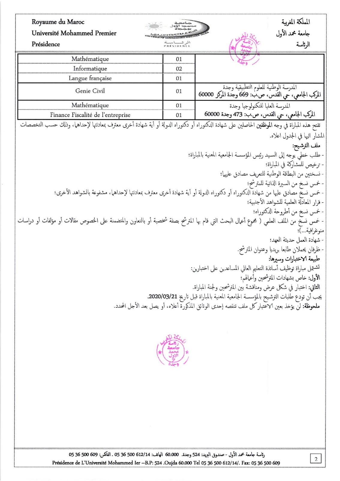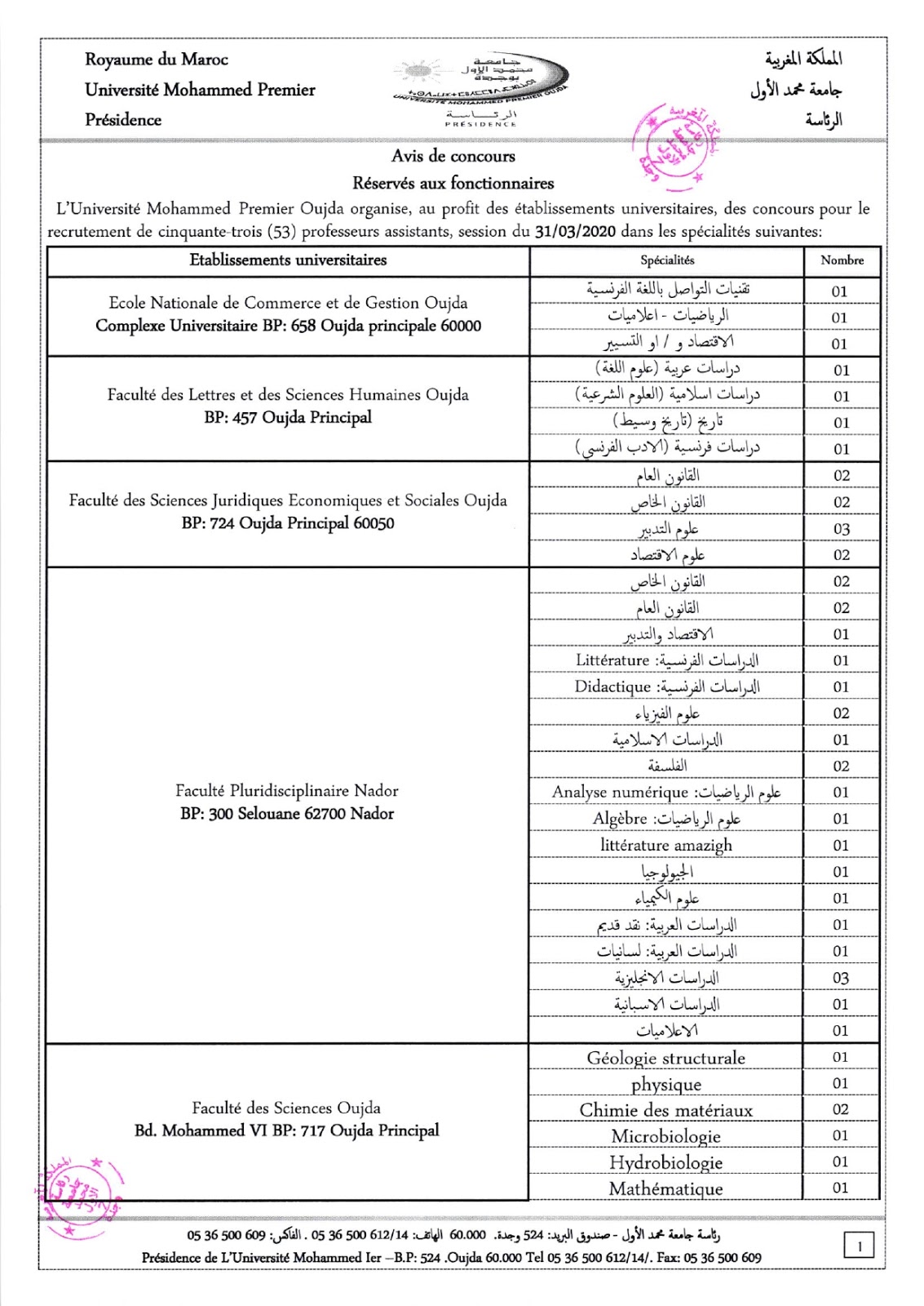 Alwadifa doctorat / Alwadifa Maroc / Alwadifa Oujda / Autres offres d'emploi / Emploi public / Etablissement Public / Offre d'emploi maroc / Offres d'emploi doctorat / Par fonction / Par ville / Type جامعة محمد الأول – وجدة مباراة توظيف 53 أستاذ مساعد آخر أجل 21 مارس 2020 ShareSharePin It جامعة محمد الأول – وجدة مباراة توظيف 53 أستاذ مساعد آخر أجل 21 مارس 2020