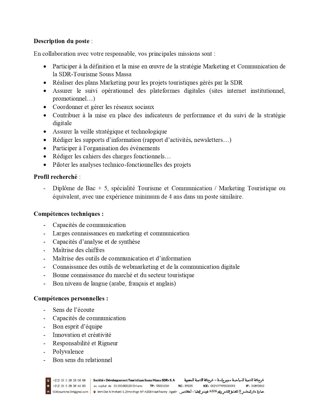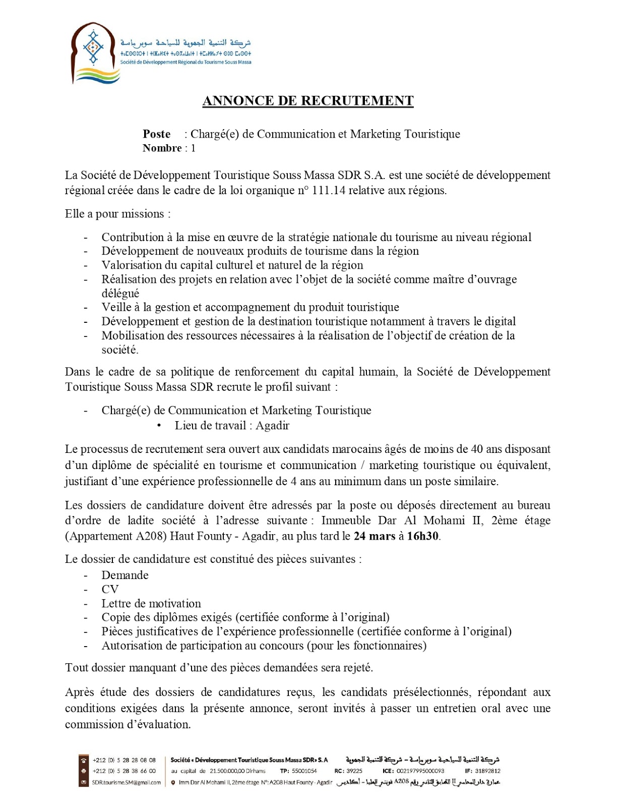 Alwadifa Maroc / Alwadifa tout le Maroc / Emploi public / Offre d'emploi maroc / Offres d'emploi Bac + 5 / Par fonction / Par ville شركة التنمية الجهوية للسياحية سوس ماسة مباراة لتوظيف 01 مكلف بالتواصل والتسويق السياحي آخر أجل 24 مارس 2020 ShareSharePin It شركة التنمية الجهوية للسياحية سوس ماسة مباراة لتوظيف 01 مكلف بالتواصل والتسويق السياحي آخر أجل 24 مارس 2020